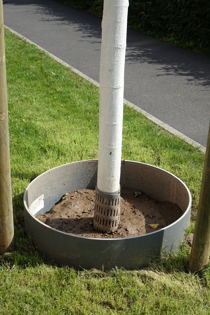 Das Prinzip in einfach: Der aus schlagzähem, wetterfestem Kunststoff gefertigte Ring sorgt dafür, dass das Gießwasser nicht abfließt, sondern zielgerichtet zum Wurzelballen geleitet wird. Für den staatlich geprüften Gartenbautechniker Borst hat das auch ganz konkrete wirtschaftliche Vorteile: „Die Bäume müssen seltener gegossen werden. Das spart Personaleinsatz und natürlich auch kostbares Wasser.“