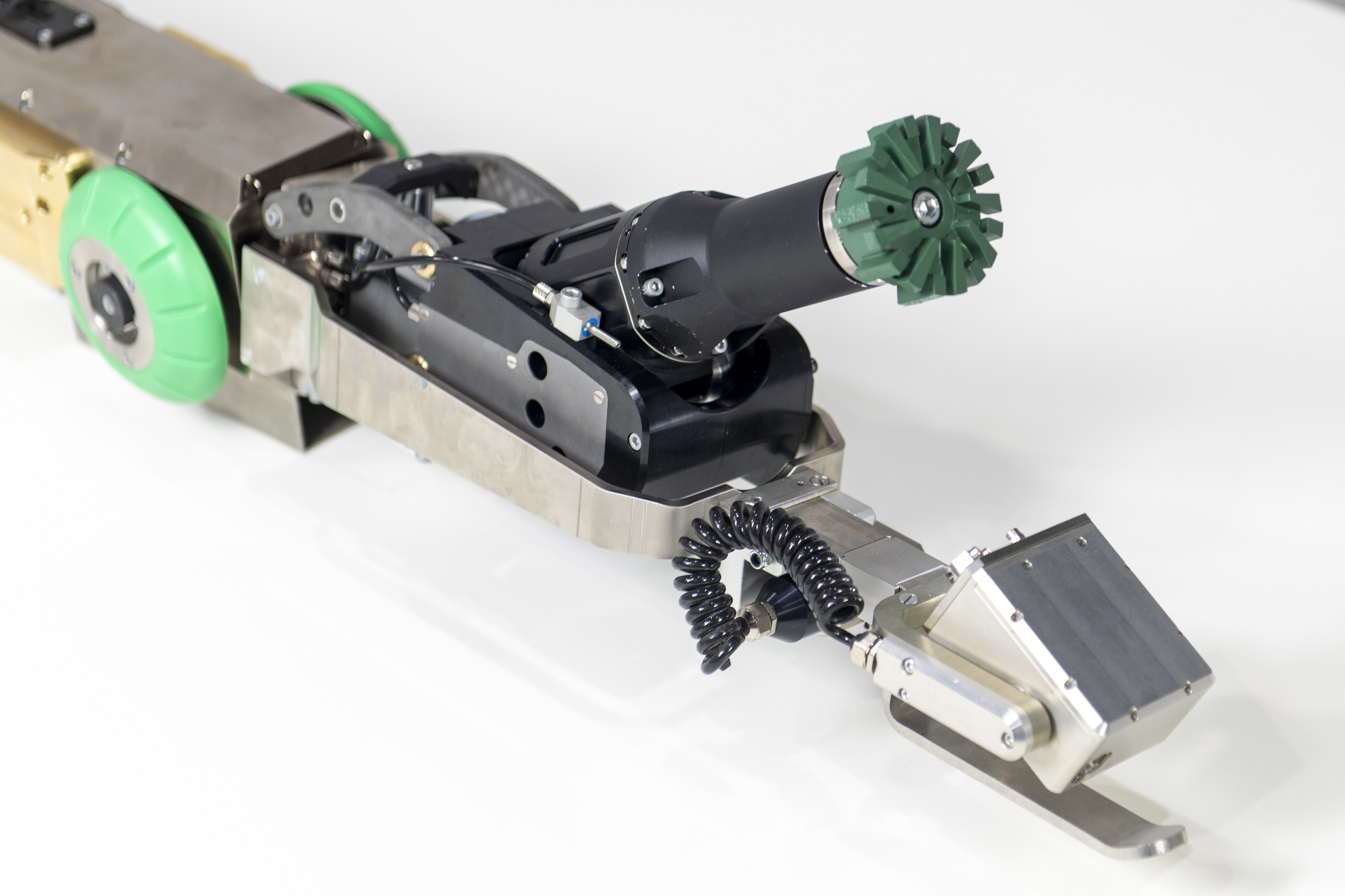 Die neuen Kanalroboter sind weltweit einzigartig mit temperaturüberwachten 48V DC Fräsmotor ausgestattet, was die Verwendung in feuchten Räumen risikolos macht. Wasserspülungen am Fräswerkzeug sowie an der Kamera sind integriert, um immer beste Sicht zu haben.