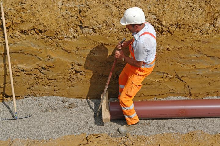 Stolz hebt aber noch einen weiteren Punkt positiv hervor, der Tiefbauern die Arbeit erleichtert: Alle Bauteile des HS®-Kanalrohrsystems werden jetzt mit einer fest eingelegten Dichtung geliefert. „Ein Vergessen der Dichtung beim Verlegen ist damit gar nicht mehr möglich“, so Stolz. Der Inhaber des ausführenden Unternehmens zeigt sich außerdem mit der Farbgebung des HS®-Kanalrohrsystems zufrieden: „Mit der Zuordnung von blau für Regenwasser und braun für Schmutzwasser kann es auch Jahre später gar nicht zu Verwechslungen kommen.“ Ein blaues Rohr wird es auch sein, das das Regenwasser aus dem Trennsystem in den Graben, der über das gesamte Baugebiet verläuft, einleiten wird. „Der Graben wird aufwändig renaturiert und soll als Vorfluter dienen. Das Regenwasser fließt von hier in ein Regenrückhaltebecken. Von diesem Puffer aus gelangt es dann gedrosselt in den nächsten Bachlauf“, erklärt der Fachbereichsleiter Tiefbau Jürgen Markert, wie die Entwässerung bei starken Regenfällen geregelt wird.