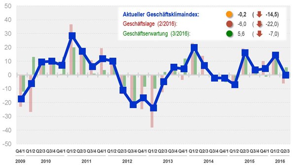 Das Geschäftsklima in der Kunststoffrohr-Industrie trübt sich im zweiten Quartal ein. Der Index – als Aggregation aus Geschäftslage und Geschäftserwartungen – sinkt mit einem Wert von -0,2 bzw. um ca. 14 Punkte gegenüber dem 1. Quartal 2016.