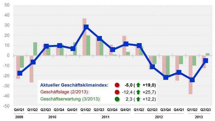 Nachdem der Geschäftsklimaindex im 1. Quartal 2013 seinen bisheri-gen Tiefpunkt erreichte, verbesser-te sich dieser im 2. Quartal um 19 Punkte auf einen Wert von -5,0. Der Anstieg ist dabei sowohl auf die Verbesserung der Geschäfts-lage als auch der Geschäftserwar-tung zurückzuführen. Nach den Tiefstwerten im 3. Quartal 2012 und im 1. Quartal 2013 ist aus heutiger Sicht, für die kommenden Quartale mit steigenden Indizes zu rechnen.
