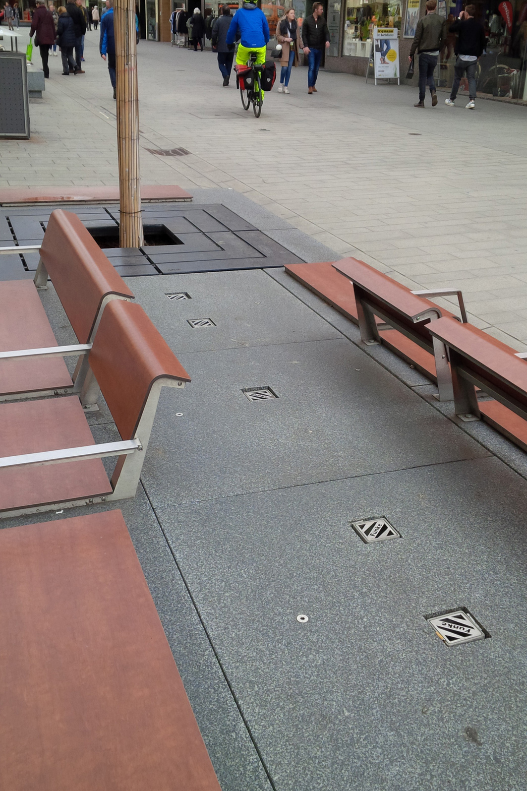 Nicht nur der im neuen Quartier Hubland eingesetzte Baumwurzelbelüfter, sondern auch der vor Ort eingebaute Baumbewässerungswinkel kam bei der Neugestaltung der rund zwei km entfernten Innenstadt ebenfalls zum Einsatz. Das Bauteil besteht aus zwei zu einem Winkel verbundenen, geschlitzten und wandverstärkten Rohren der Nennweite DN/OD 160; die Länge der Schenkel beträgt ca. 1,30 m.