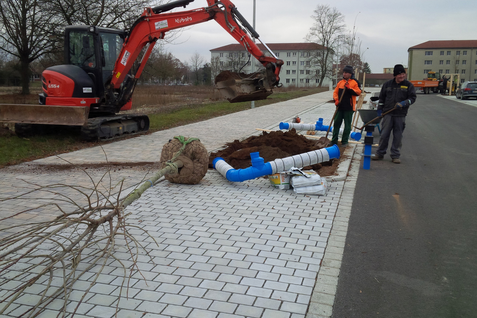 Bei der vom Gartenamt der Stadt Würzburg geplanten Begrünung der Erschließungstraßen im neuen Stadtteil Hubland baute die MR – Maschinenring Franken GmbH im Rahmen der Pflanzarbeiten ebenfalls die Baumbewässerungswinkel ein, wohingegen die Baumwurzelbelüfter hier von der Depenbrock Bau GmbH & Co. KG eingesetzt wurden.