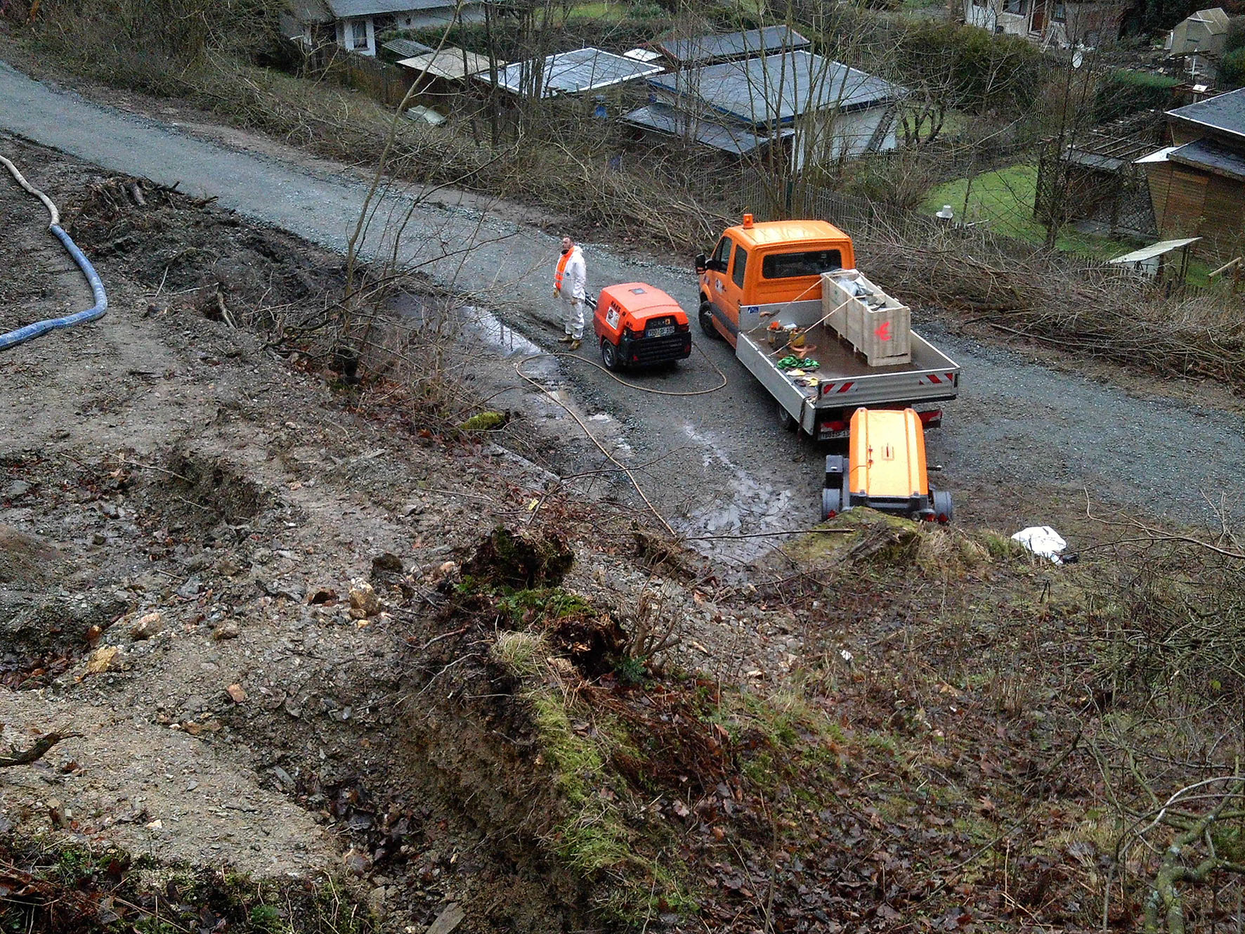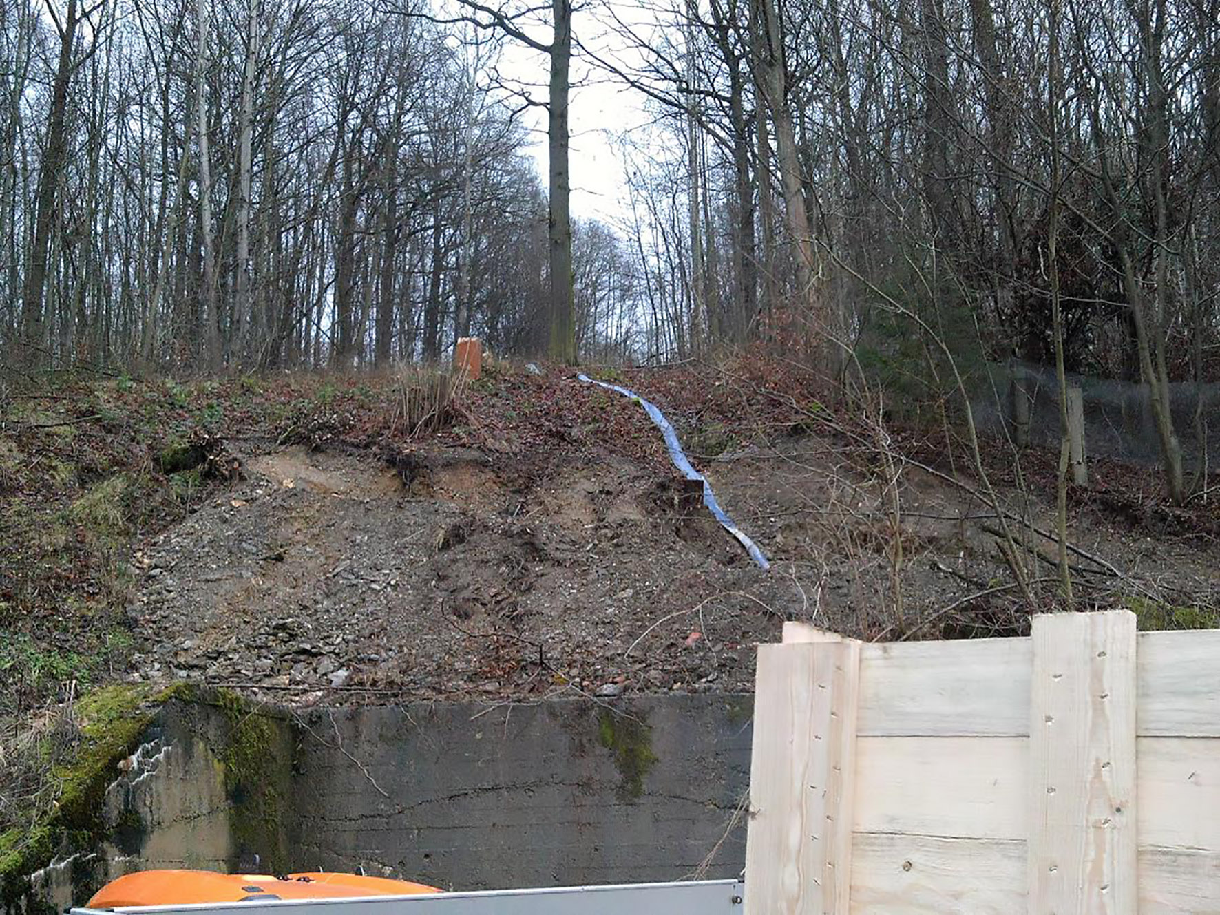 Die Leitung, die in dem starken Gefälle auch noch zweigrößere Bögen aufweist, sowie ihr oberer Zugangsschacht liegen mitten im Wald; eine offene Erneuerung des Rohrs wäre technisch und wirtschaftlich extrem aufwändig gewesen und hätte vor allem ein angeschlossenes Wohngebiet über eine längere Zeitvon der Entsorgung abgekoppelt, bei einem Regenwetter-Abfluss im Rohr von bis zu 300 l/sec: Indiskutabel.