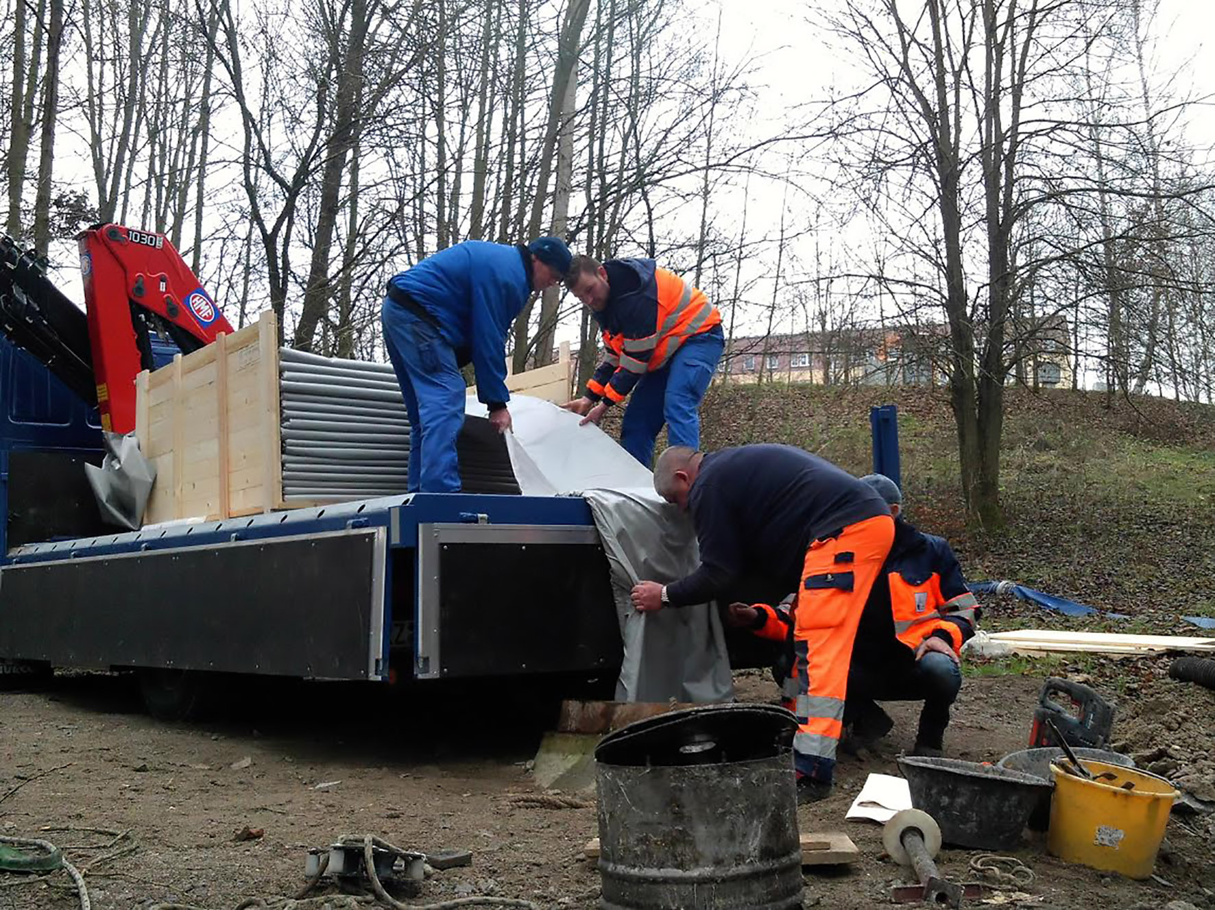 Um den Einbau überhaupt vornehmen zu können, wurde vorbereitend eine Baustraße durch den Wald zum oberen Zugangsschacht der Leitung verlegt.Von diesem Schacht aus zog man per Stahlseil den mit einem photoreaktiven Harz getränkten Glasfaserschlauch ins Rohr bis zum Endschacht unterhalb der Gefällestrecke ein, verschloss ihn beidseitig mit Drucktöpfen und kalibrierte ihn schließlich pneumatisch auf.