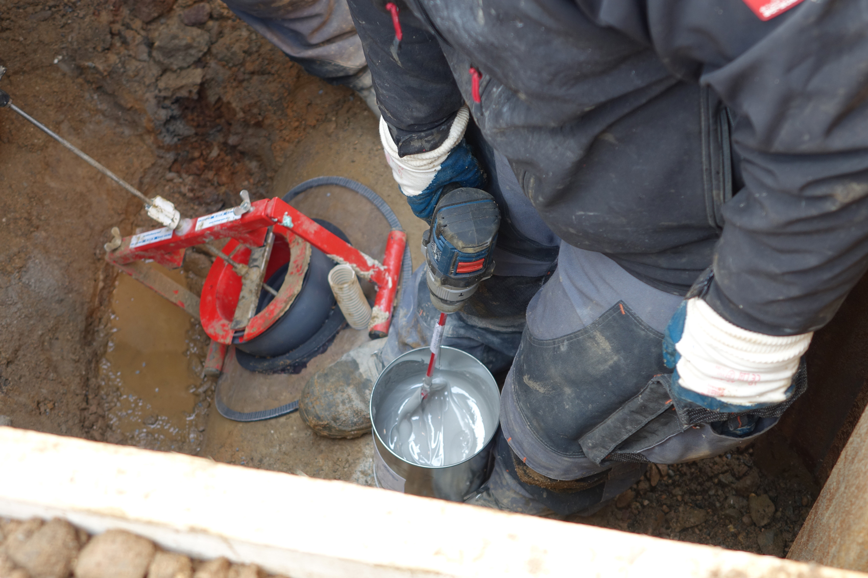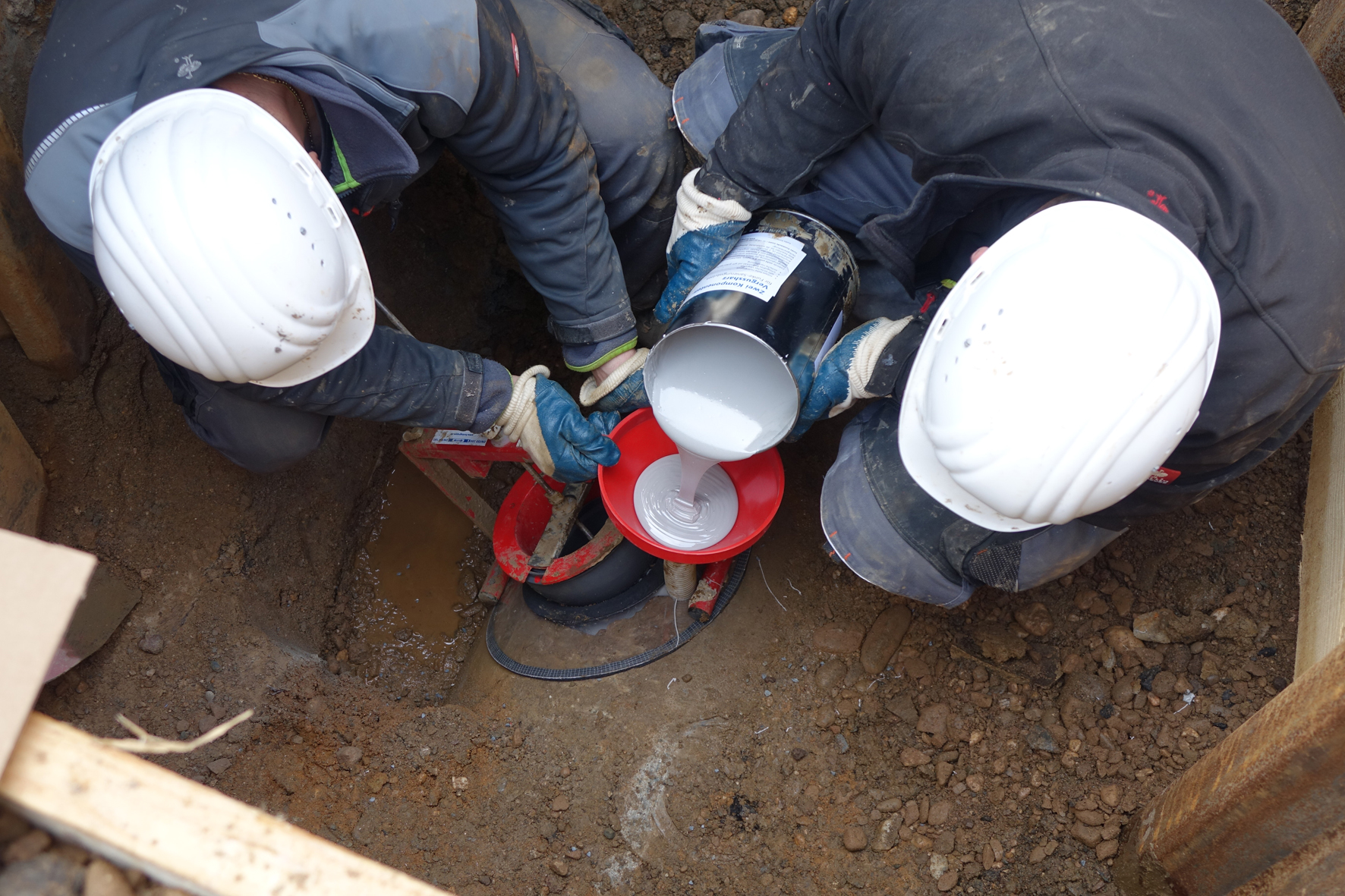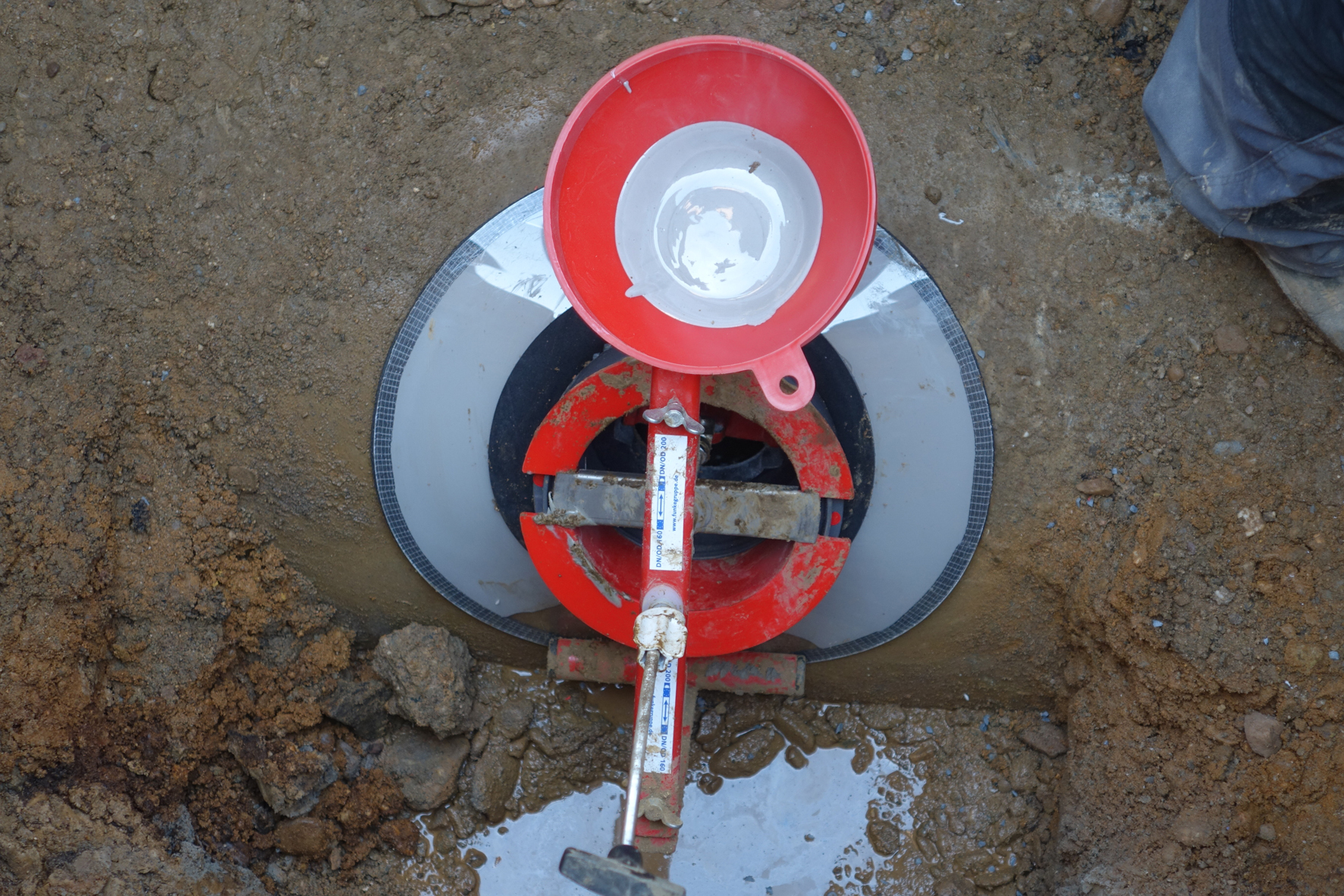 Danach wird die Öffnung von außen mit der transparenten Außenverschalung abgedeckt und, ebenfalls unter Nutzung der Gewindestange, der Sanierungsstutzen eingesetzt. Zum Schluss wird über die Gewindestange ein Metallbügel auf dem Sanierungsstutzen angedreht und die gesamte Konstruktion mit einem Schraubenschlüssel festgezogen – die Innenverschalung legt sich kraftschlüssig an die Rohrinnenwandung an. Für zuverlässige Dichtheit sorgt ein spezielles, innerhalb von zwei Stunden aushärtendes Vergussharz, das über einen Schlauch und einen Trichter eingebracht wird. Die transparente Außenverschalung gestattet dabei eine Sichtkontrolle und hilft so eine gleichmäßige Verteilung des Harzes sicherzustellen.