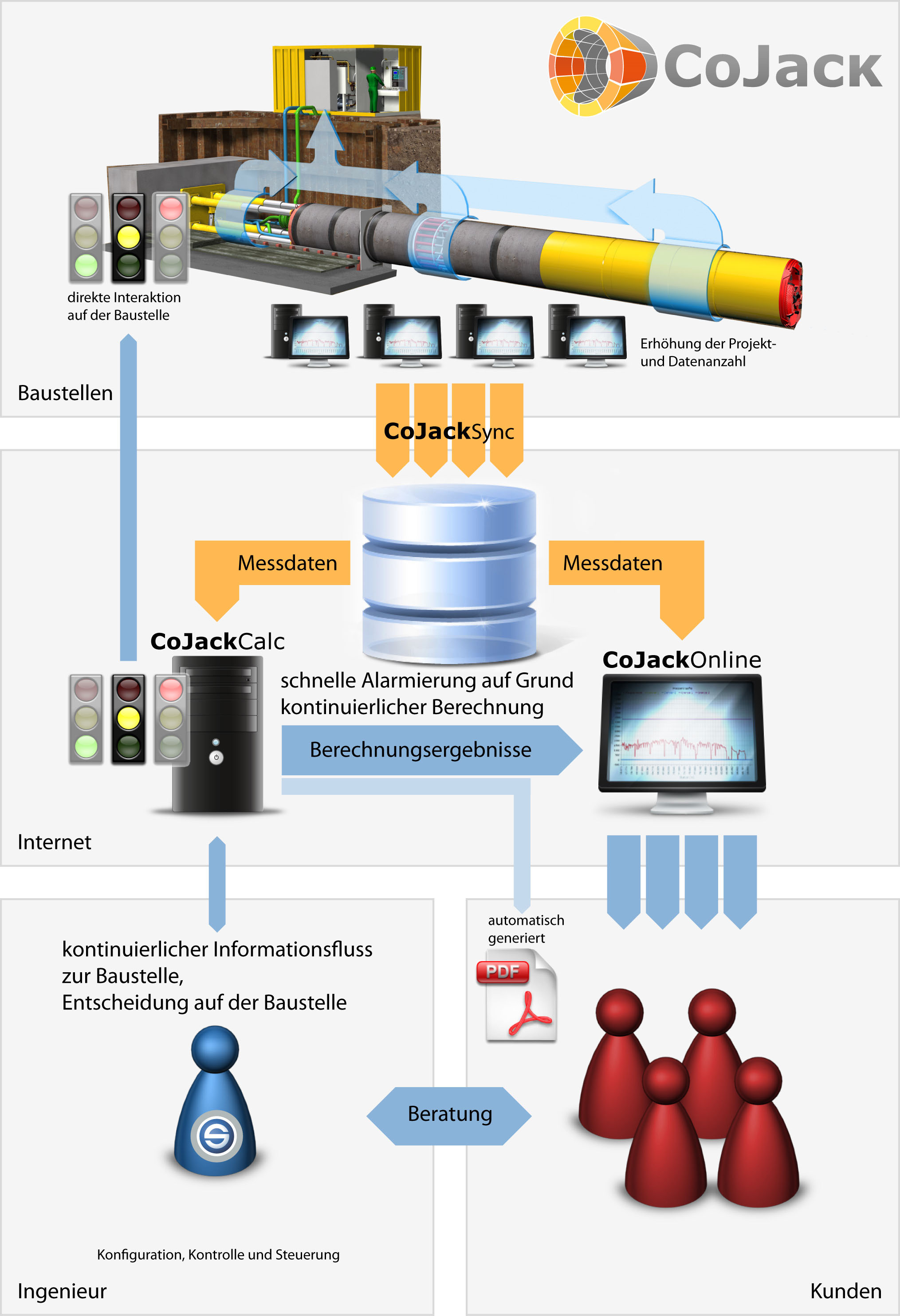CoJackHydra ist die Kombination einer neuen, für schwierige Rohrvortriebstrassen optimierten hydraulischen Rohrverbindung (siehe Bild 1) mit einem speziell darauf abgestimmten elektronischen Überwachungssystem. Das wesentliche Merkmal von CoJackHydra ist die hydraulische Kraftübertragung in Verbindung mit einer vor Ort installierten Sensorik, die Messwerte für eine komfortable und zuverlässige Online-Überwachung mit CoJack (siehe Bild 2) liefert. Selbst Raum- und S-Kurven mit engen Radien können nun problemlos mit hohen zulässigen Vortriebskräften aufgefahren werden.