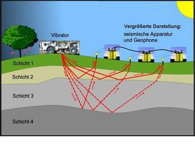 | Vibroseismik Bei der heute üblichen Reflexionsseismik wird die besonders umweltschonende und anpassungsfähige Vibroseis-Technik eingesetzt. Spezielle Vibratorfahrzeuge erzeugen sanfte Druckwellen an der Erdoberfläche im Frequenzbereich von ca. 12-100 Hertz. Diese Wellen werden im Untergrund an den Grenzschichten und den Störungen der verschiedenen Gesteine reflektiert. Über Geophone wird das so entstandene „Echo“ registriert und per Kabel zu einem zentralen Messfahrzeug geführt. Am Computer werden daraus Graphiken erzeugt, an denen man die Strukturen der Gesteinsschichten ablesen kann. |