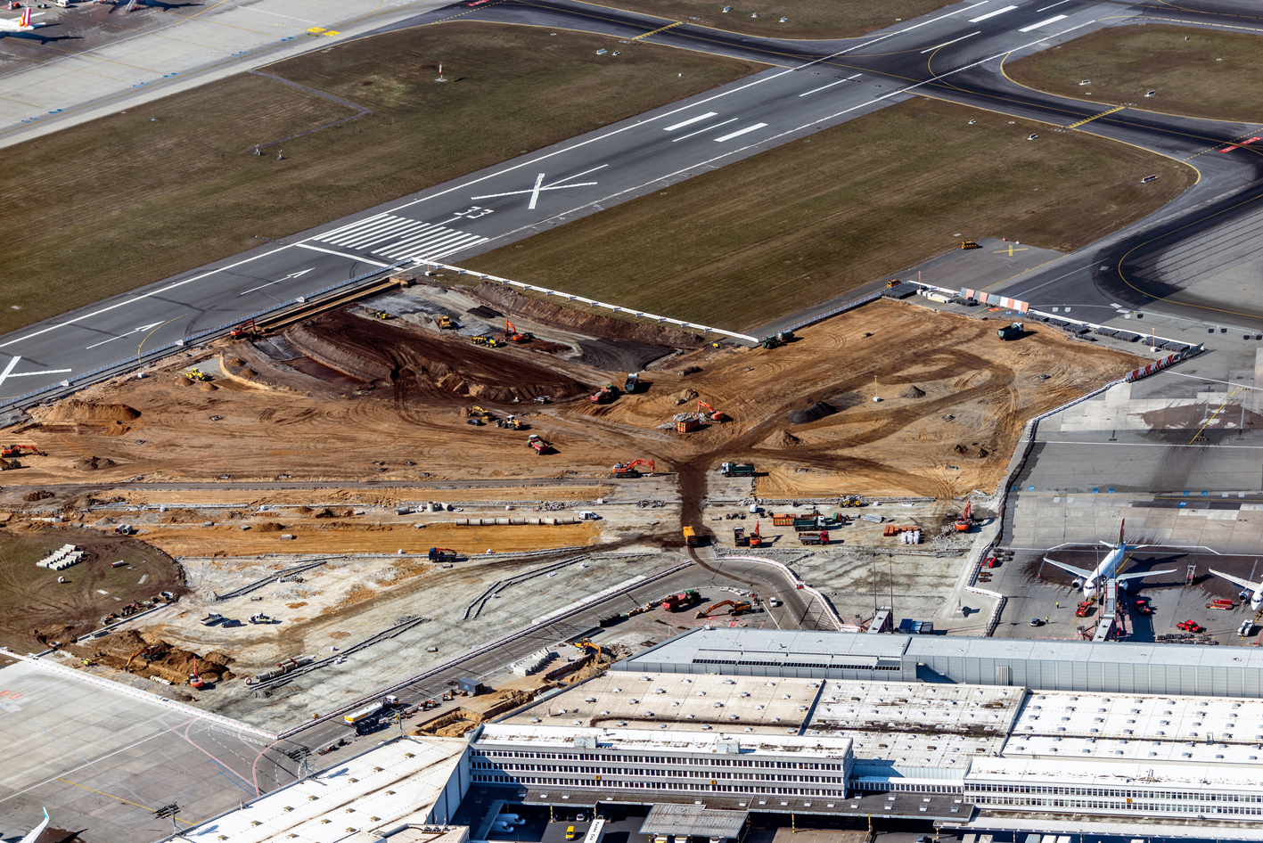 Seit März 2016 laufen die Bauarbeiten am Vorfeld 1. Da nicht nur die Betonoberflächen des Vorfeldes schadhaft waren, sondern flächendeckend auch die gesamte Regenwasserkanalisation, entschied sich der Bauherr dafür, die vorhandenen Anlagen komplett auszutauschen. Im Rahmen der Grundinstandsetzung entstehen 27 Positionen im Pierbereich und 15 Positionen auf den zwei Remoteinseln. Die Anforderungen an die Entwässerung und die zu verwendenden Materialien waren dabei entsprechend hoch.