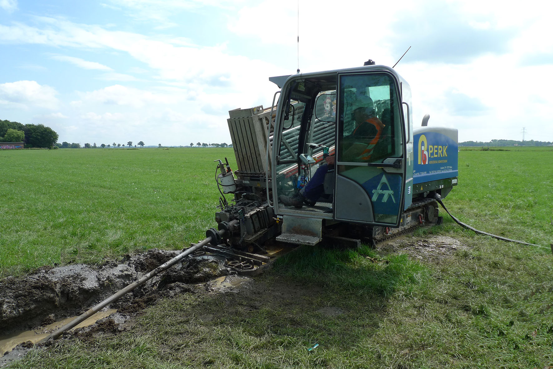 Das im Tief-, Kanal- , Kabelbau und Rohrleitungsbau renommierte Unternehmen beschäftigt etwa 150 Mitarbeiter und hat 4 Bohrkolonnen für die Bohranlagen Grundodrill 15 N und Grundodrill 15 XPT, sowie für mehrere Grundomat-Erdraketen im Einsatz. Die Aufgabe bestand in der Verlegung eines Schutzrohres PEHD 560 x 33,2 mm. Die Rohrdimension erforderte einen flachen Biegeradius mit einer Bohrlänge von 90 m. Der tiefste Punkt der Bohrung lag bei 8 m. Dabei war auch der stabilisierende, hochverdichtete Sandkern im Straßen- und Bohrtrassenbereich zu berücksichtigen.