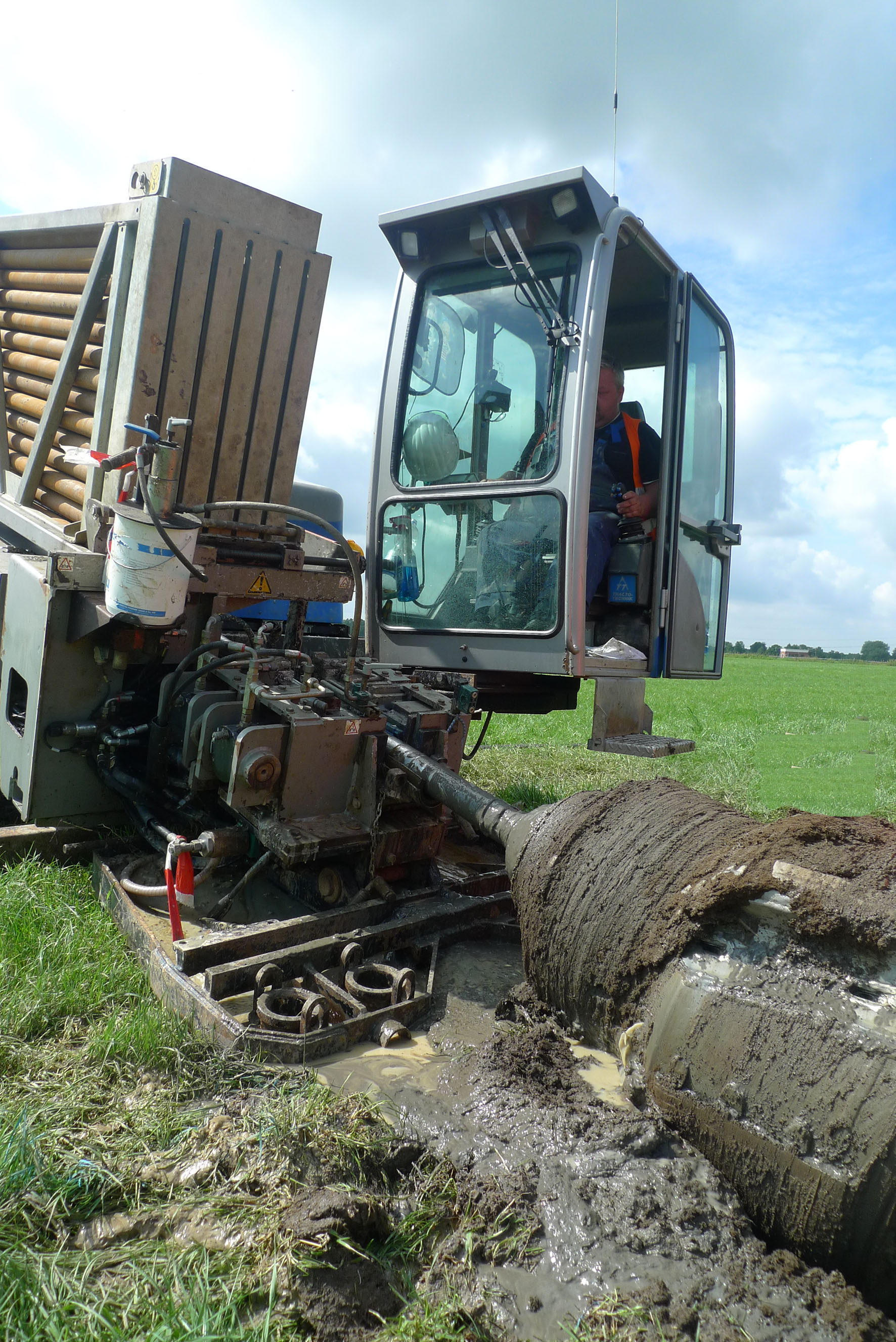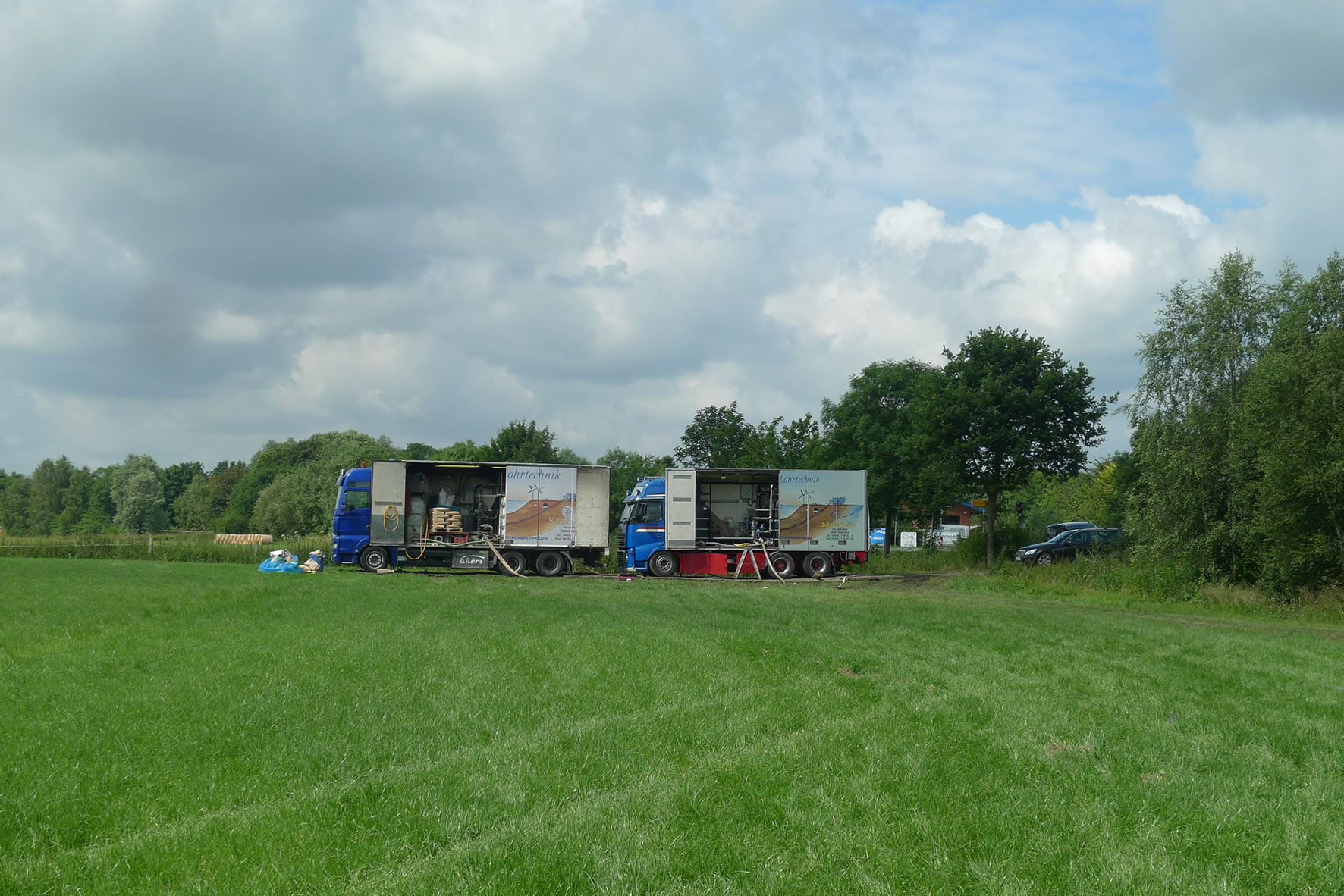 Der Grundodrill 15N wurde entsprechend der Vorgaben etwa 30 m vom Straßendamm entfernt positioniert. Die Bohrspülung wurde mit 80 kg/m3 Eurogel Xtra und wegen des sauren Bodencharakters mit 0,5 kg/m3 Sodazusatz angemischt. Geologe Karsten Schwader von AMC bestätigte die absolute Unbedenklichkeit der Bohrspülung. 2 Mischanlagen sorgten für eine kontinuierliche Bereitstellung der Bohrspülung. Die gebrauchte Spülung wurde abgesaugt und von 3 bereitstehenden Traktoren in Güllefässern zur Entsorgung in eine Deponie verbracht. „Die Pilotbohrung dauerte nur etwa 2 Stunden“, so Bohrgeräteführer Heino-Andreas Emken, der die Bohranlage seit etwa 1 Jahr bedient.