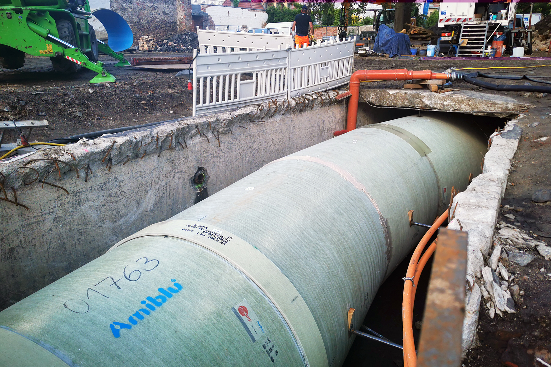 Dass GFK-Rohre in puncto Belastbarkeit überzeugende Argumente liefern, zeigte sich im Auswahlverfahren: Für den in geschlossener Bauweise zu erneuernden Hauptkanal war ohnehin der Einsatz von kreisrunden GFK-Rohren vorgesehen. Für die in offener Bauweise zu erneuernden 40 m jedoch sollten laut Ausschreibung Maulprofile aus Stahlbeton eingesetzt werden. Der Einsatz kreisrunder Rohre kam in diesem Bereich aufgrund geringer Überdeckung über dem Rohrscheitel nicht in Frage. Erst ein von Amiblu gemeinsam mit STRABAG ausgearbeiteter Sondervorschlag brachte hierfür glasfaserverstärkte Kunststoffrohre ins Spiel. Dabei zeigte sich schnell, dass GFK-Rohre auch für die offene Verlegung die bessere Wahl waren.
