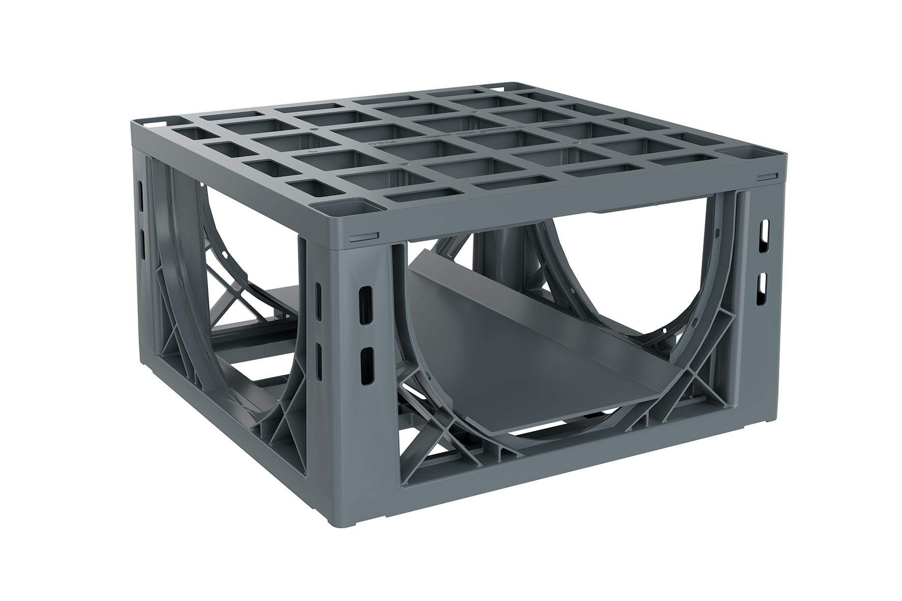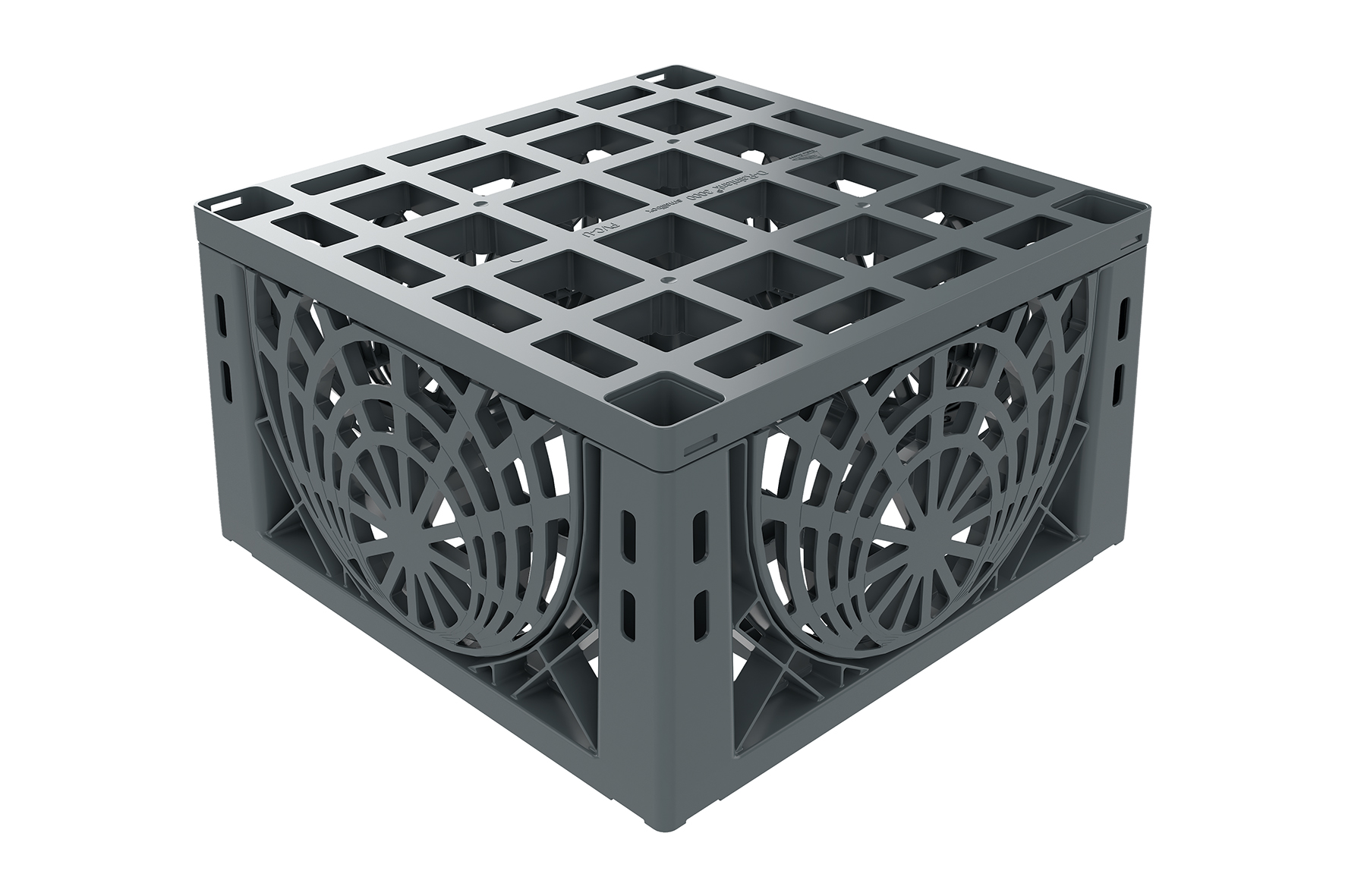 Die D-Raintank 3000 smallbox®-Elemente werden gebrauchsfertig auf die Baustelle geliefert. Sie bestehen aus einer Gitterplatte mit jeweils vier lastabtragenden Säulen. Die Konstruktion sorgt für eine optimale Kraftübertragung ins umliegende Erdreich.