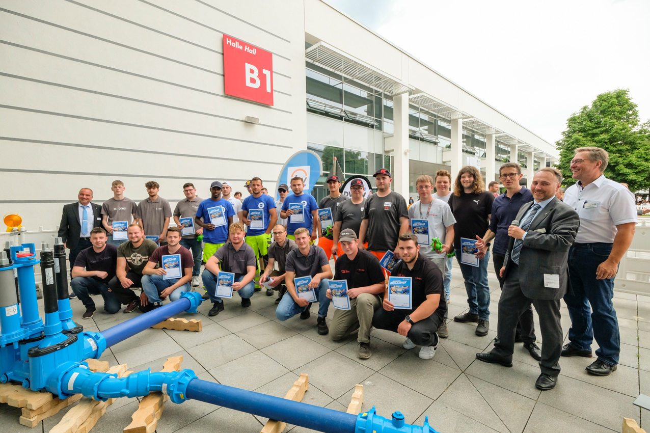 Wie schon vor vier Jahren war die Leitungsbau Challenge eines der rbv-Highlights zur IFAT. Der gemeinsam mit dem Deutschen Verein des Gas- und Wasserfachs e. V. (DVGW) organisierte und ausgetragene Wettbewerb steht ganz im Zeichen der Nachwuchsgewinnung. Denn der Fachkräftemangel verstärkt sich ebenfalls im Leitungsbau zunehmend. Grund genug, interessierten Jugendlichen und vor der Berufswahl Stehenden eindrucksvoll vor Augen zu führen, wie anspruchsvoll das Berufsbild des Leitungsbaus ist. Zu diesem Zwecke haben am 31. Mai und am 1. Juni neun Teams aus Auszubildenden und jungen Fachkräften aus den Reihen von Leitungsbau- und Versorgungsunternehmen ihr Fachkönnen vor einem breiten Messepublikum demonstriert. Während der Challenge standen sie vor der Aufgabe, ein Wasserverteilungssystem aus Guss- und PE-Rohren zu bauen und eine Reparaturschelle mit einer Flanschverbindung zu montieren.
