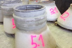 Um verschiedene Einbauvarianten zu erfassen wurde der Schachtrahmen zum einen direkt auf den Konus und zum anderen auf zwei verbaute Ausgleichsringe gesetzt. Es wurden Aufbauten sowohl mit als auch ohne Adapterring und ohne und mit Verschiebesicherung untersucht. Pro Versuchsaufbau wurden zwei Versuche durchgeführt. Die auftretenden Kräfte und Verschiebewege wurden erfasst. Insgesamt wurden an 12 Probekörpern Versuche durchgeführt.