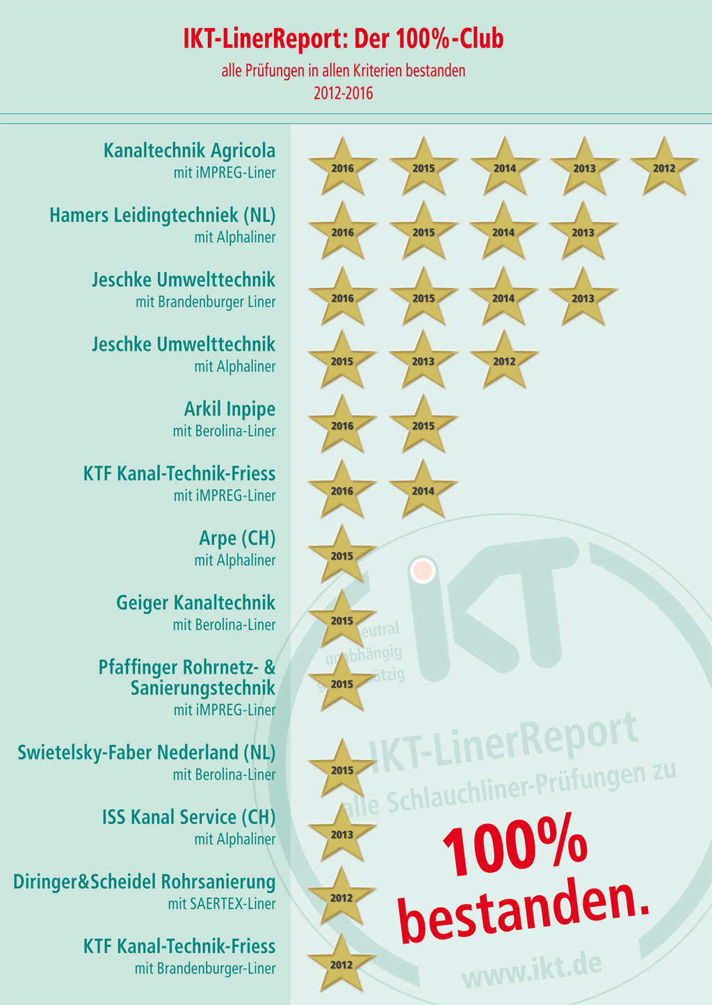 Die Sanierungsfirmen, die in einem Jahr mit allen ihren Liner-Proben alle vier Prüfkriterien erfüllen, bilden so etwas wie einen „100%-Club“. Sie erfüllen damit die Anforderungen der ZTV Materialprüfung und ihrer Kunden vollständig. Nur wenige Firmen schaffen diese Glanzleistung über mehrere Jahre hinweg.