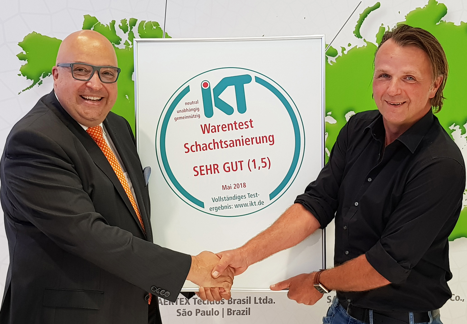 Swietelsky-Faber hat mit seinem SF-Schachtliner im Nachtest zum IKT-Warentest „Schachtsanierung“ mit der Note „Sehr gut (1,5)“ abgeschnitten. Roland W. Waniek, Geschäftsführer des IKT - Institut für Unterirdische Infrastruktur, überreichte auf der IFAT 2018 das IKT-Warentest-Siegel an Jörg Brunecker, Geschäftsführer von Swietelsky-Faber. SAERTEX multiCom, an deren Messestand die Übergabe stattfand, hatte den Liner zugeliefert.