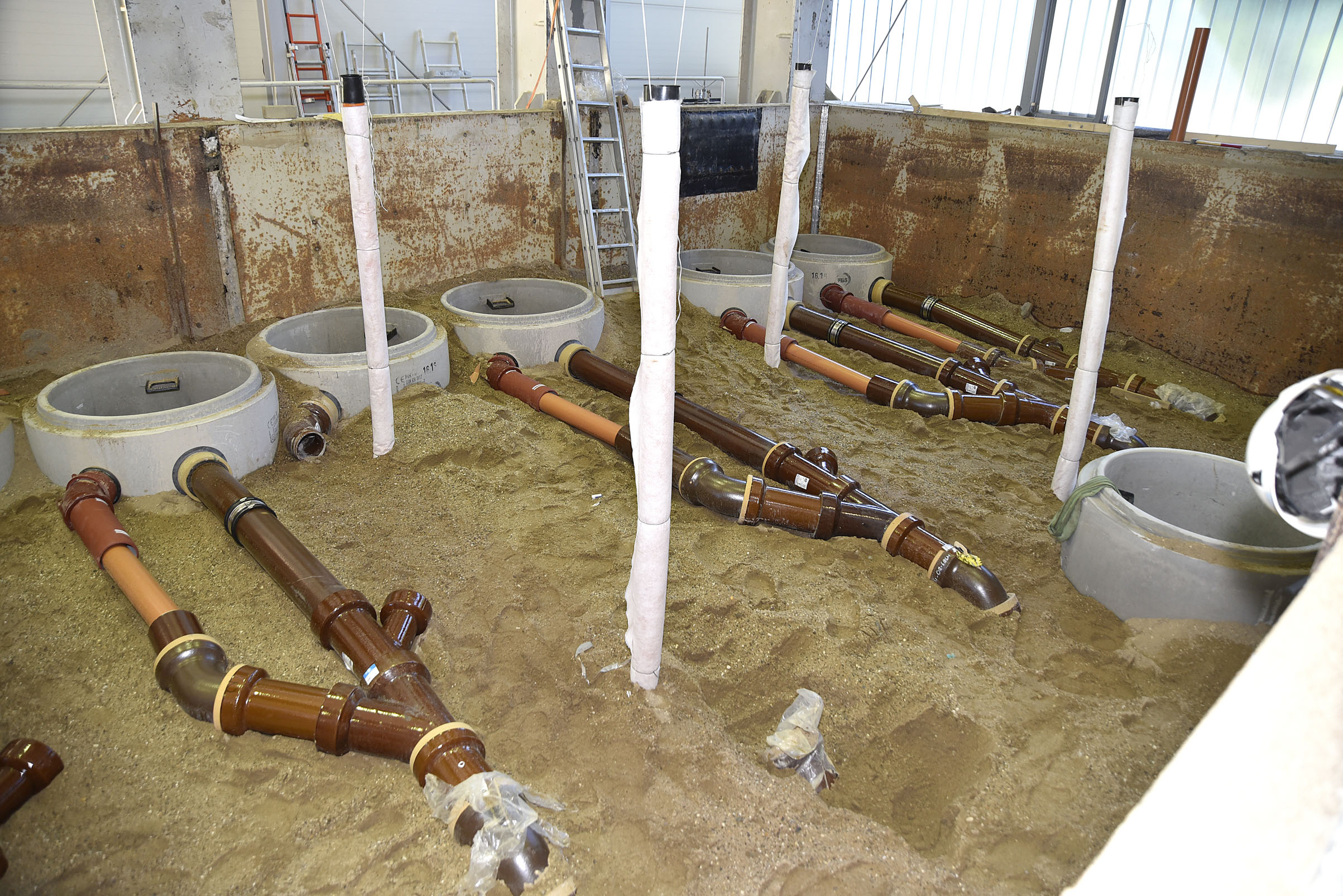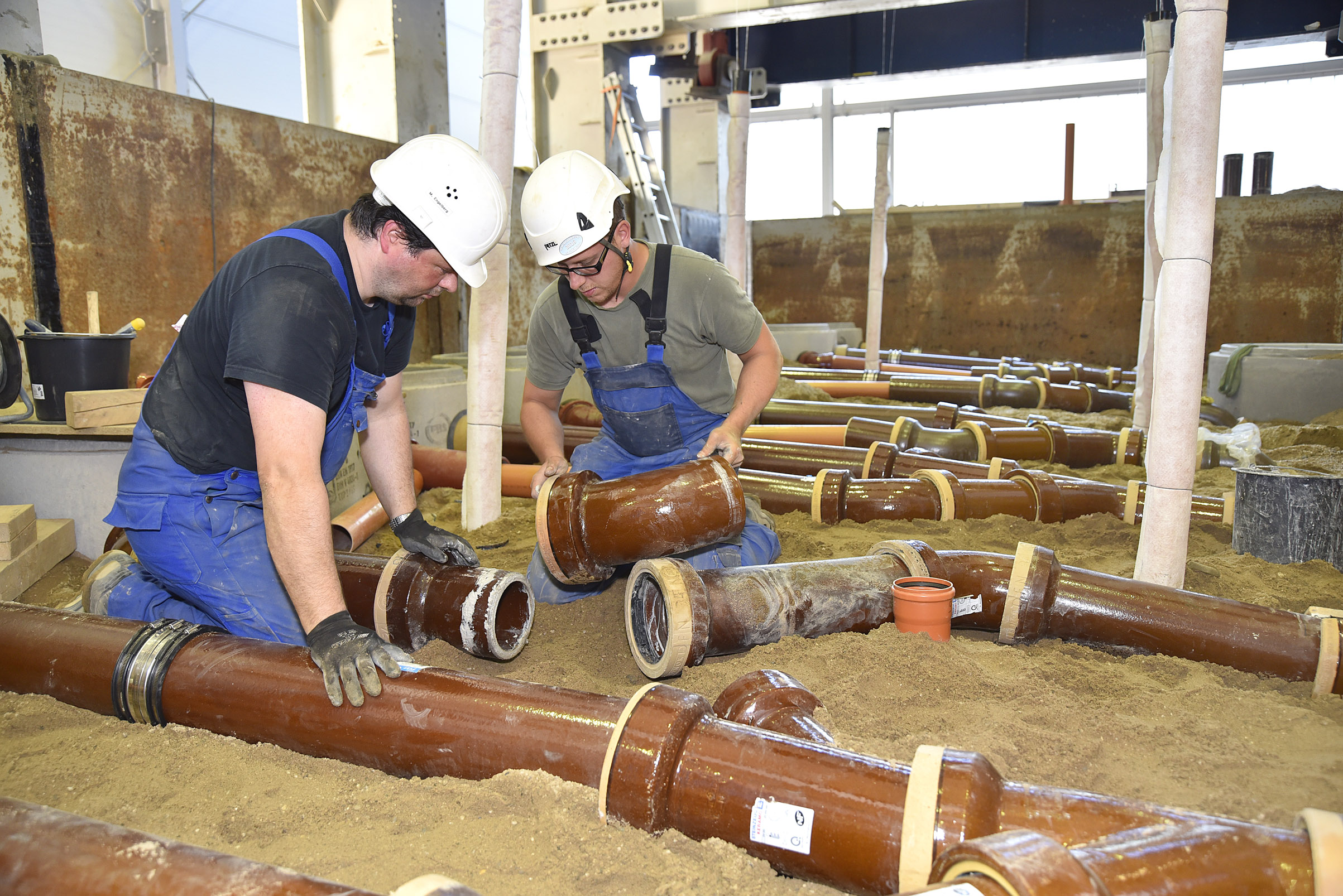 Für den vom nordrhein-westfälischen Umweltministerium geförderten IKT-Warentest „Kurzliner für Hausanschlüsse“ hat das IKT insgesamt acht Versuchsaufbauten mit jeweils einer unteren und zwei oberen Leitungen in seinen 15 Meter langen, sechs Meter breiten und sechs Meter tiefen Großversuchsstand eingebaut.
