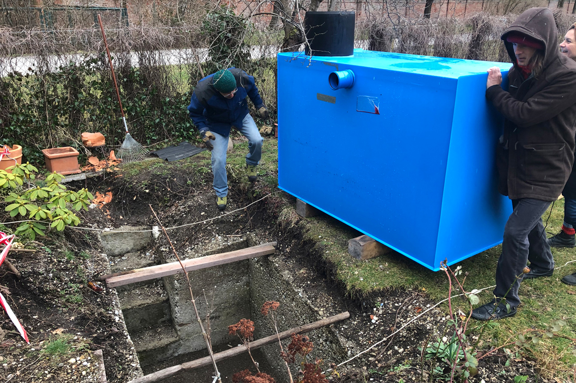 Das war auch der Ansatz von Magdalena Nickl und Vincent Kalnin in München: Von einem befreundeten Kleingärtner auf die Produkte von Funke aufmerksam gemacht, bauten sie in einen brachliegenden alten Keller aus Betonwänden eine KS-Bluebox® mit einem Fassungsvermögen von rund 2 m3 ein.