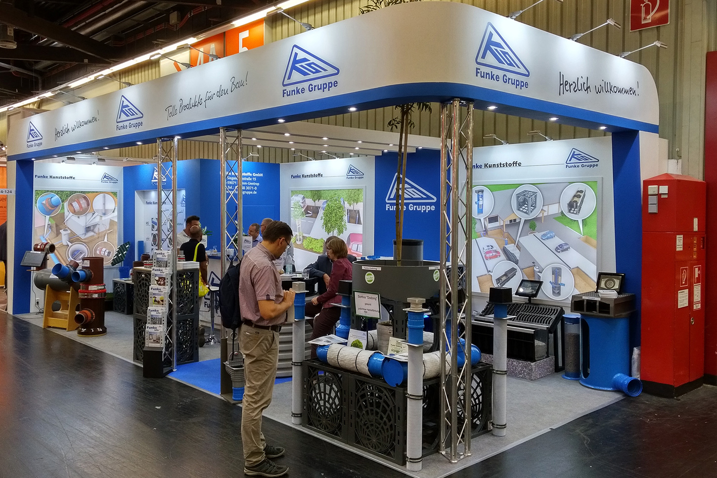Hier waren es insbesondere die vielfältigen Lösungen für Hausanschlüsse und Rohrverbindungen, welche Landschaftsgärtner, Baustoffhändler, Landschaftsarchitekten und kommunale Auftraggeber gleichermaßen interessierten. „Wir bieten moderne und nachhaltige Komplettlösungen vom Haus bis zum Sammler und die Vorteile dieses Systemgedankens haben die Anwender erkannt“ – das hat Vertriebsleiter Borgmann aus den vielen Gesprächen auf dem Funke-Messestand mitgenommen.