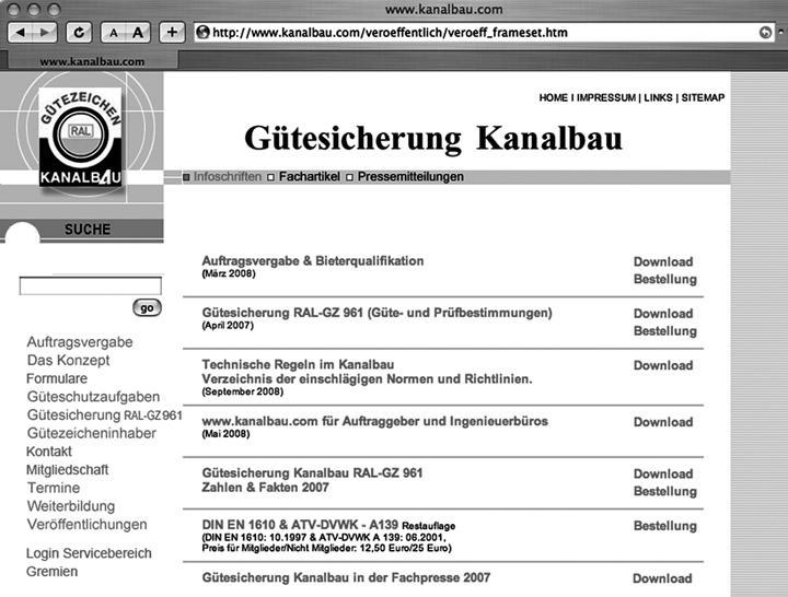 Diese gedruckten Informationen werden in regelmäßigen Zeitabständen aktualisiert. Neue Printmedien kommen hinzu. In diesem Jahr hat der Güteschutz Kanalbau unter anderem eine Serie von Flyern neu herausgegeben. Thematisch gekennzeichnet mit den Begriffen „Grundlagen“ und „Qualifikationen“ bieten die Faltblätter grundlegende Informationen zu Themen wie „Entstehung und Entwicklung“, „Kanalbau online“, dem „Güteausschuss“ und den verschiedenen Beurteilungsgruppen von AK (offener Kanalbau) bis hin zu ABS (Ausschreibung und Bauüberwachung von Sanierungsmaßnahmen).