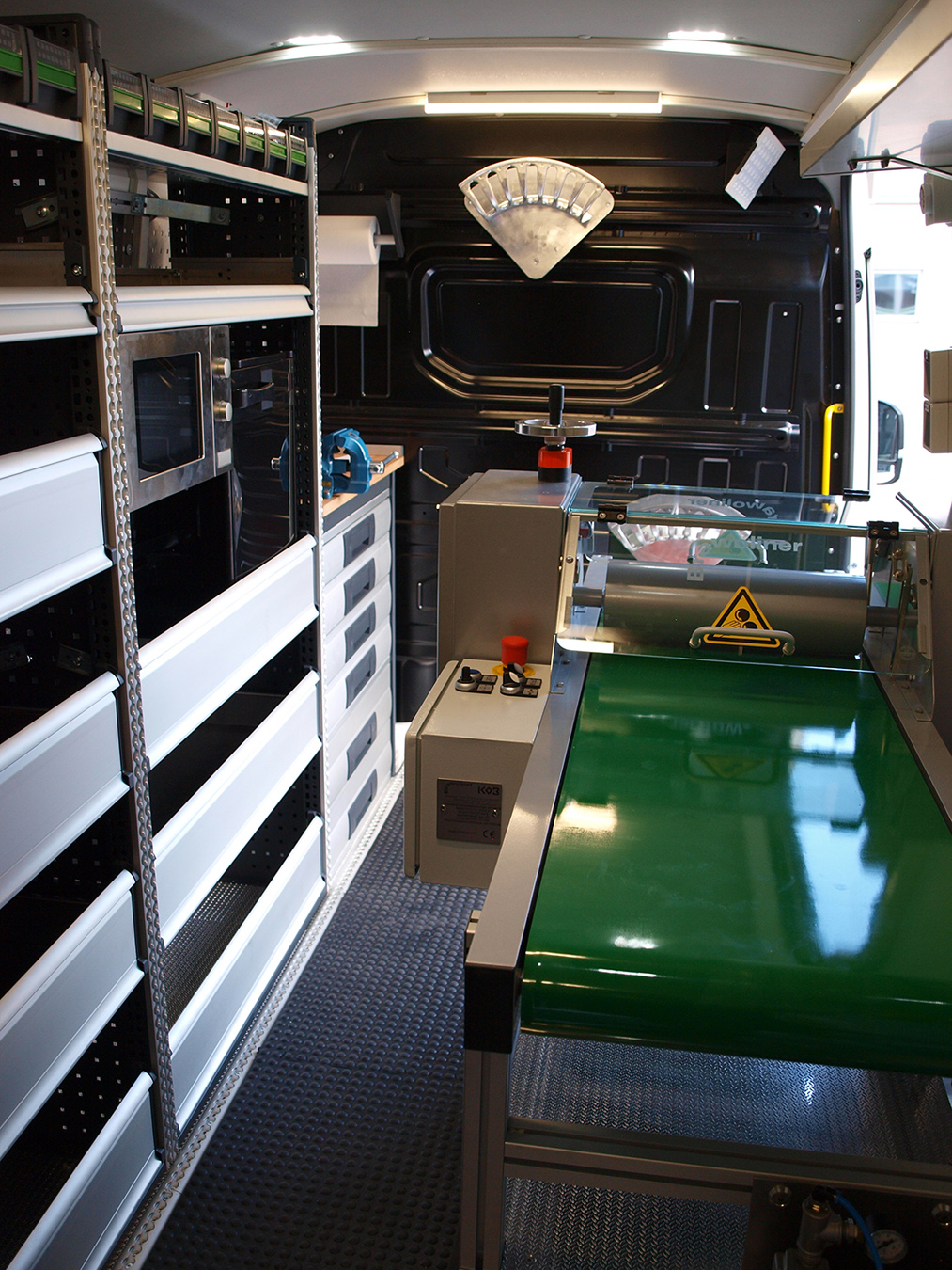 Beim Ausbau des VW Crafters wurde darauf Wert gelegt, möglichst viel Stauraum und Platz zu bieten: Im extra angefertigten Sockel für den Hochdruckspüler (26 PS) befinden sich mehrere Schwerlastschubladen, weiterer Stauraum sowie eine Werkbank mit Schraubstock befindet sich gegenüber der Imprägnieranlage. Für zusätzlichen Komfort für die Mitarbeiter sorgen die eingebaute Mikrowelle und der Kühlschrank. Die Arbeitssicherheit auf den Baustellen wird durch zwei LED-Strahler, die den Außenbereich ausleichten, erhöht.