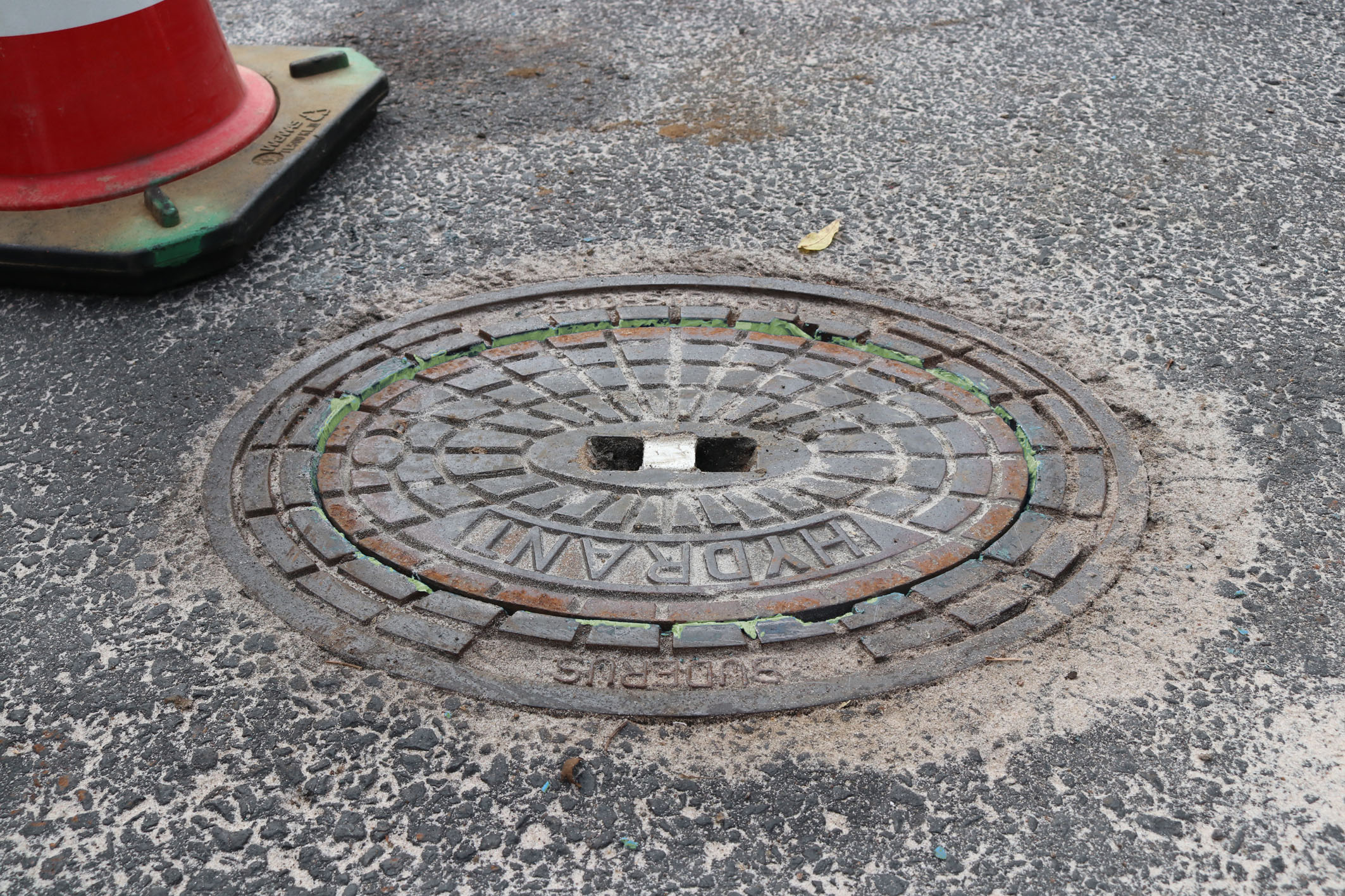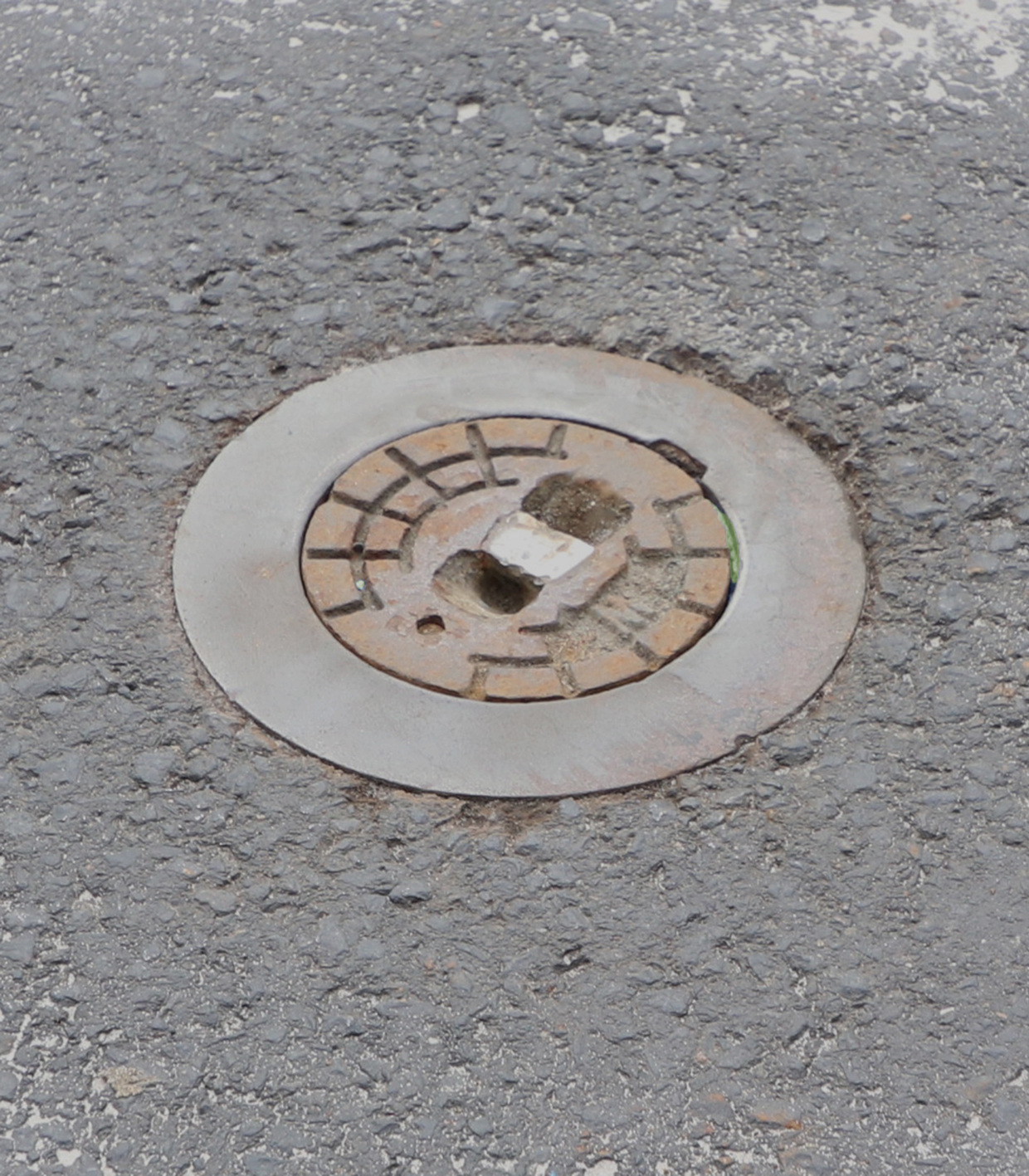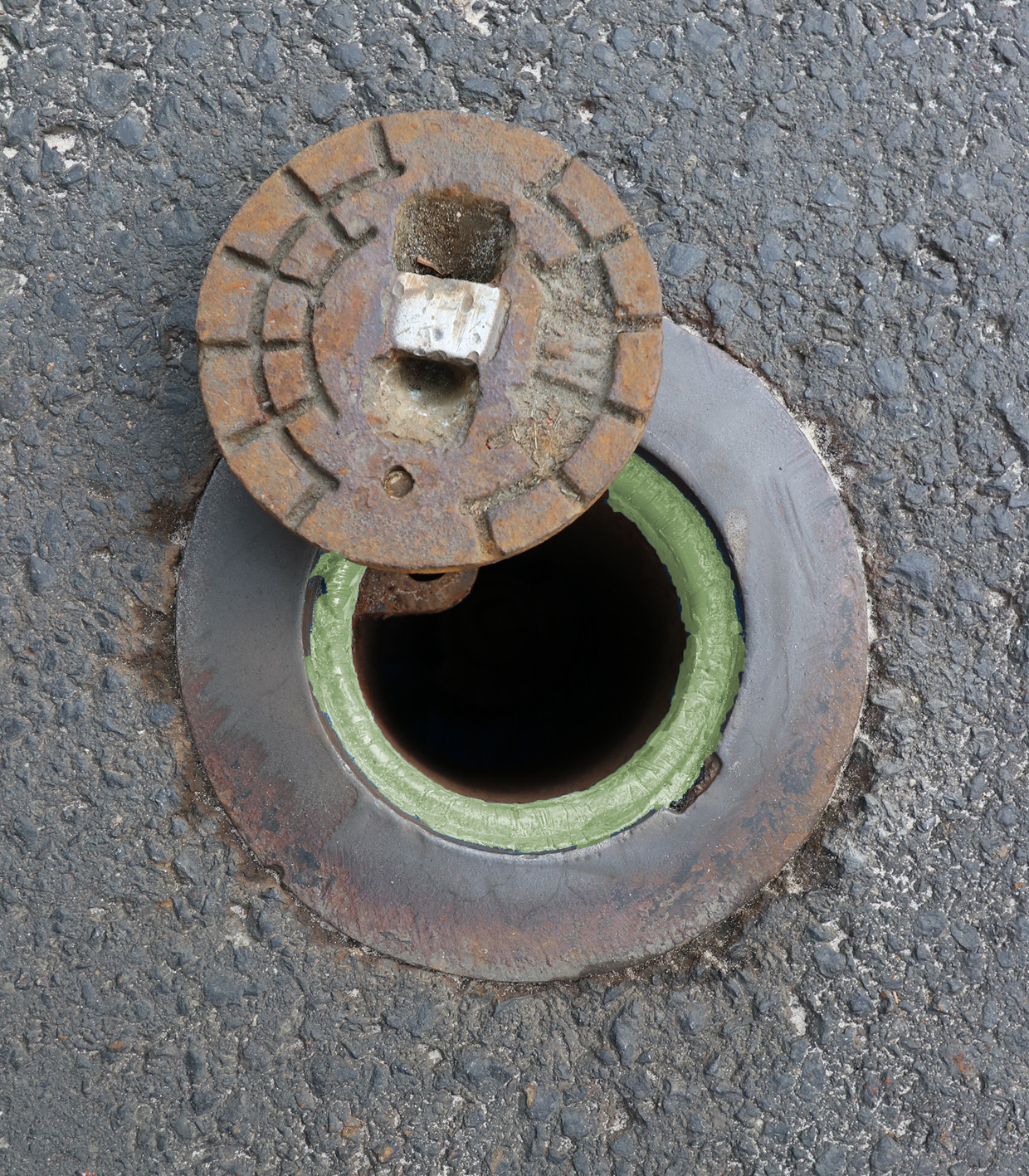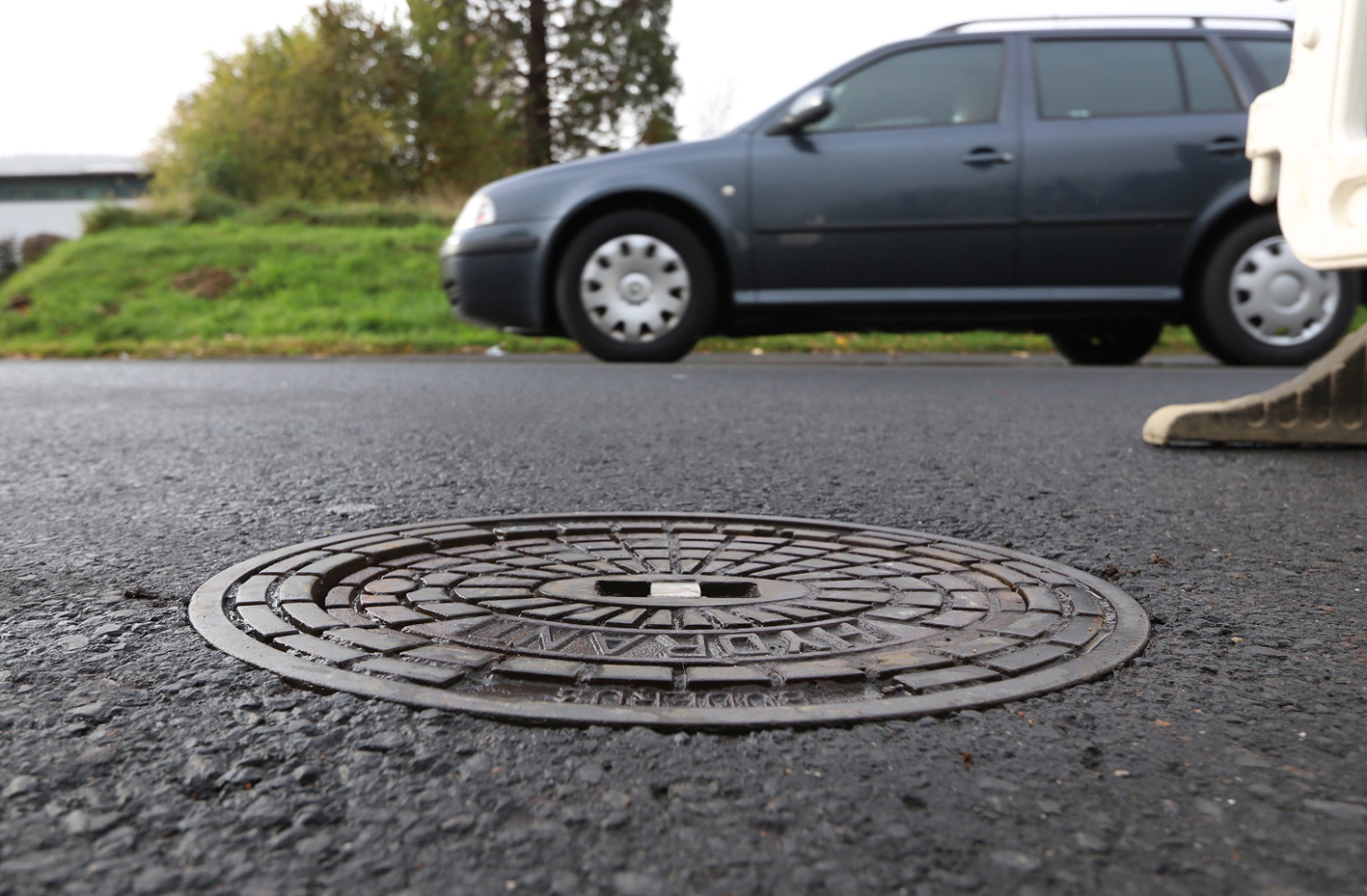 Direkt in der Spur von Lkw und Pkw liegt eine ovale Hydrantenkappe, der man die Belastung, der sie täglich ausgesetzt ist, deutlich ansieht: Der Deckel ist in Fahrtrichtung verschoben und einseitig deutlich unter Fahrbahnniveau abgesackt. Dadurch bekommt die Kappe jedesmal, wenn ein Fahrzeug direkt darüberfährt, einen erneuten Schlag ab, der umso härter ausfällt, je mehr der Deckel der Belastung nachgibt.