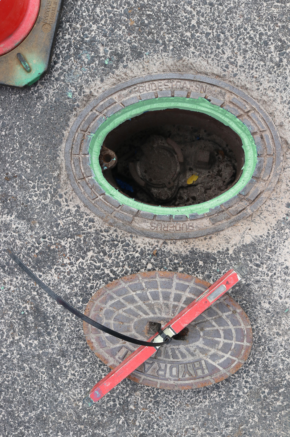 Harz und Härter, die im „Flüsterkappen“-Set in mengenmäßig aufeinander abgestimmten Gebinden geliefert werden, werden sorgfältig gemischt und anschließend in erforderlicher Menge gleichmäßig auf die Auflagefläche für den Hydrantenkappendeckel aufgetragen, bevor dieser – vom Harz getrennt durch eine Trennfolie - wieder passgenau eingelegt wird. Zuvor wurde er per Kabelbinder an einer Fixierstange befestigt, um ihn während der Aushärtung des Harzes auf Fahrbahnniveau zu halten.