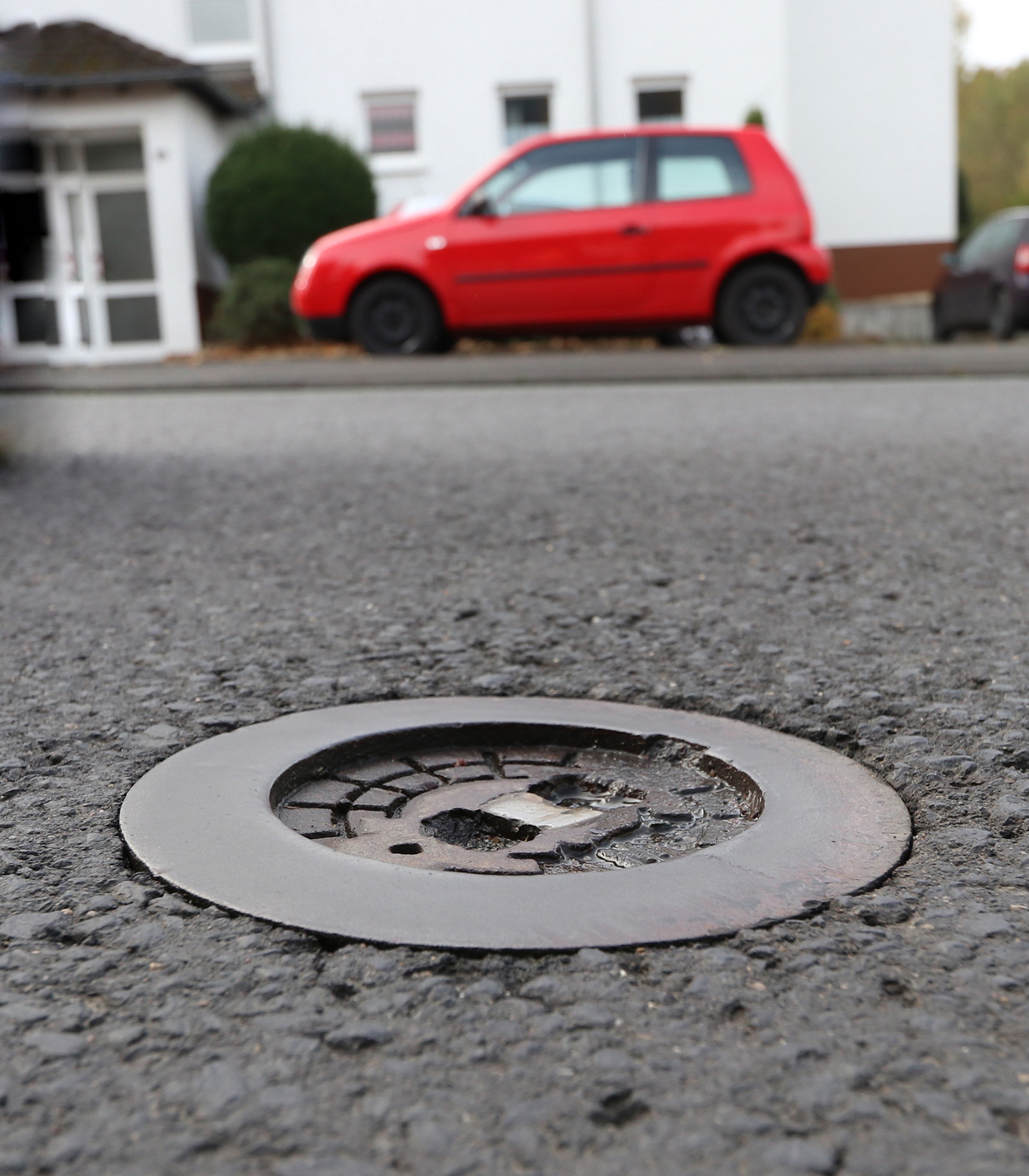 Auf der Landesstraße 531 liegt die Fahrzeugbelastung in der Ortsdurchfahrt Burbach bei über 10.000 Fahrzeugen pro Tag. Hier bietet sich gleich eine ganze Reihe von Straßenkappen für eine Reparatur an. Unter der Verkehrsbelastung haben die Deckel dieser Kappen bereits nach sieben Jahren nachgegeben.