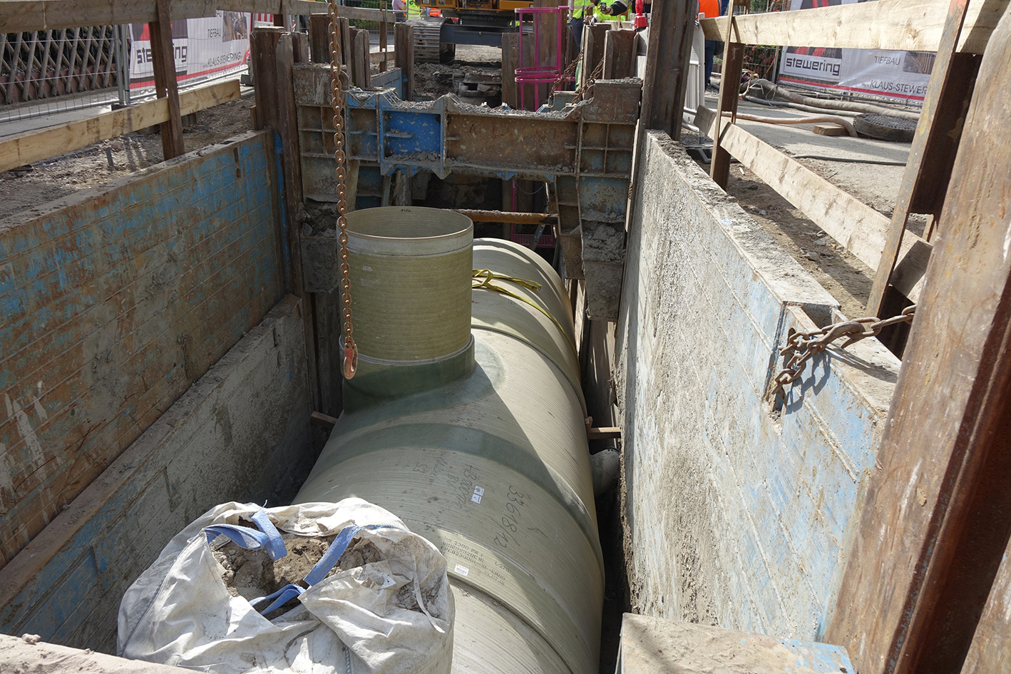 „Dank der glatten Innenoberfläche unserer GFK-Rohre kann bei dem vorliegenden Gefälle des Stauraumkanals von 7,5 Promille auf die Trockenwetterrinne verzichtet werden“, erklärt Holger Hörnemann, Gebietsverkaufsleiter von Amiblu einen weiteren Vorteil des Werkstoffes GFK. „Darüber hinaus wirkt sich das geringe Rohrgewicht von 2,3 Tonnen beim Handling auf der Baustelle ebenfalls positiv aus.“