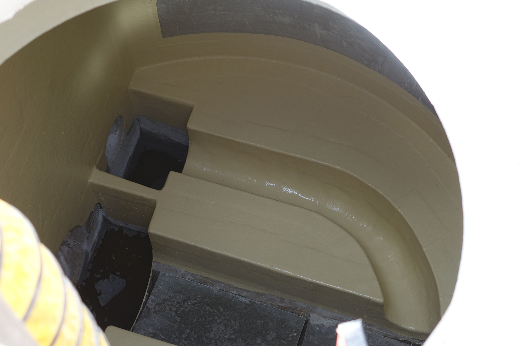 Der Zulaufschacht ist werkseitig mit einem leicht exzentrisch angeordneten Trichter ausgestattet, durch den Zufluss des Abwassers im Trockenwetterfall in den Stauraumkanal erfolgt. Für die Montage des Drosselschiebers DN 400 im Drosselschacht ist eine Betonwand eingebaut, die werkseitig hergestellt und mit GFK laminiert wurde.