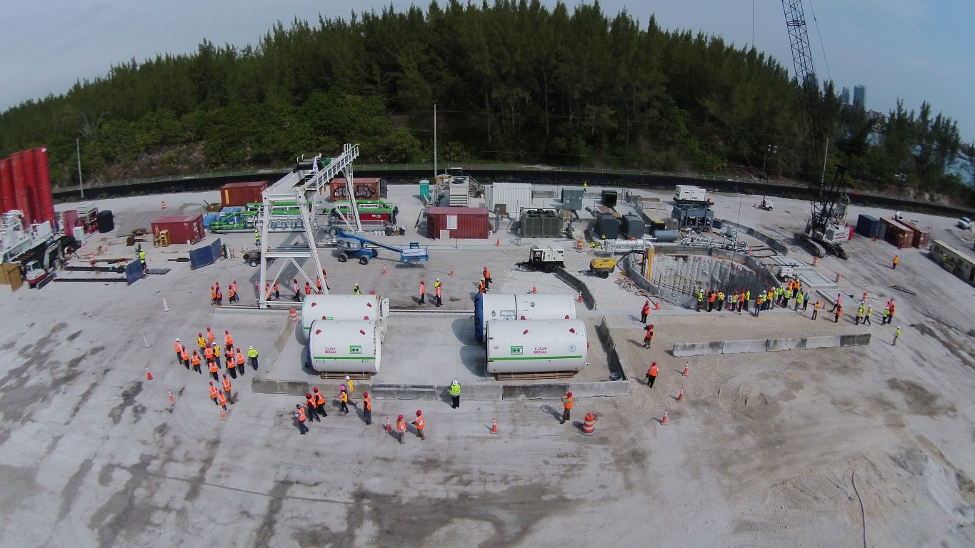 In einer Tiefe von bis zu 21 Metern unter dem Meeresspiegel grub sich die 3,13 Meter große „Dorsey“ in den nächsten Monaten voran. Der Durchbruch erfolgte nach 227 Arbeitstagen am 16. Februar 2016 auf Fisher Island – Bestleistungen von bis zu 24 Metern pro Tag und rund 300 Metern pro Monat bestätigten die optimale Konfiguration der TBM. Bis Ende des Jahres soll die neue 60“ Druckrohrleitung im fertigen Schutztunnel verlegt und in Betrieb genommen werden.