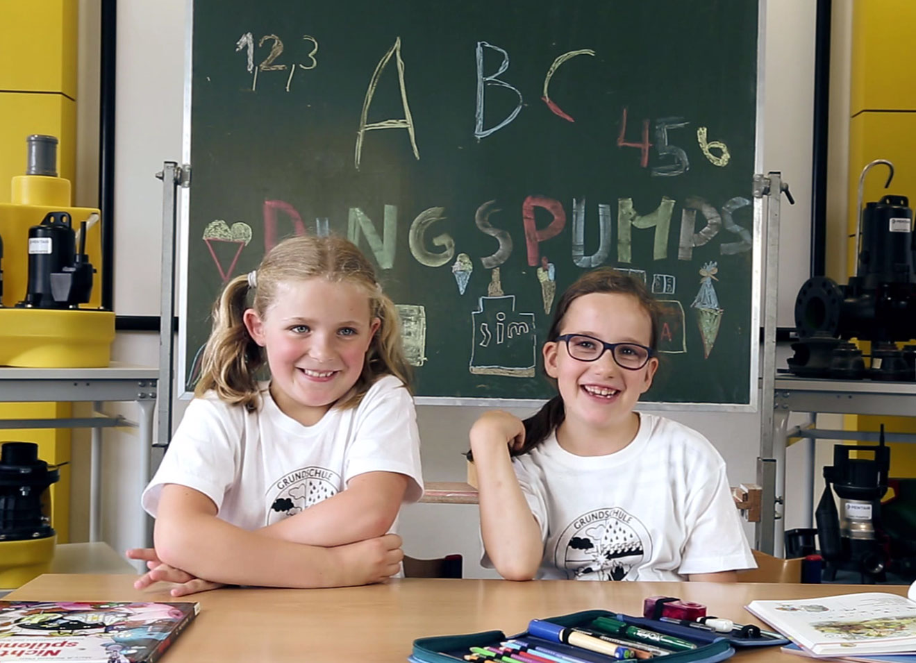 Gemeinsam mit Schülern der Grundschule Amshausen hat der Steinhagener Abwasserspezialist Pentair Jung Pumpen insgesamt 11 DingsPumps-Videos erstellt, in denen Begriffe wie: Installateur, Hebeanlage, Rückstau, Abwasser, SmartHome und weitere von Zweit- und Drittklässlern erläutert werden. Jeweils in zweier Teams fanden sich die Schüler in einem eigens präparierten „Klassenraum“ zusammen und gaben ihr Bestes.