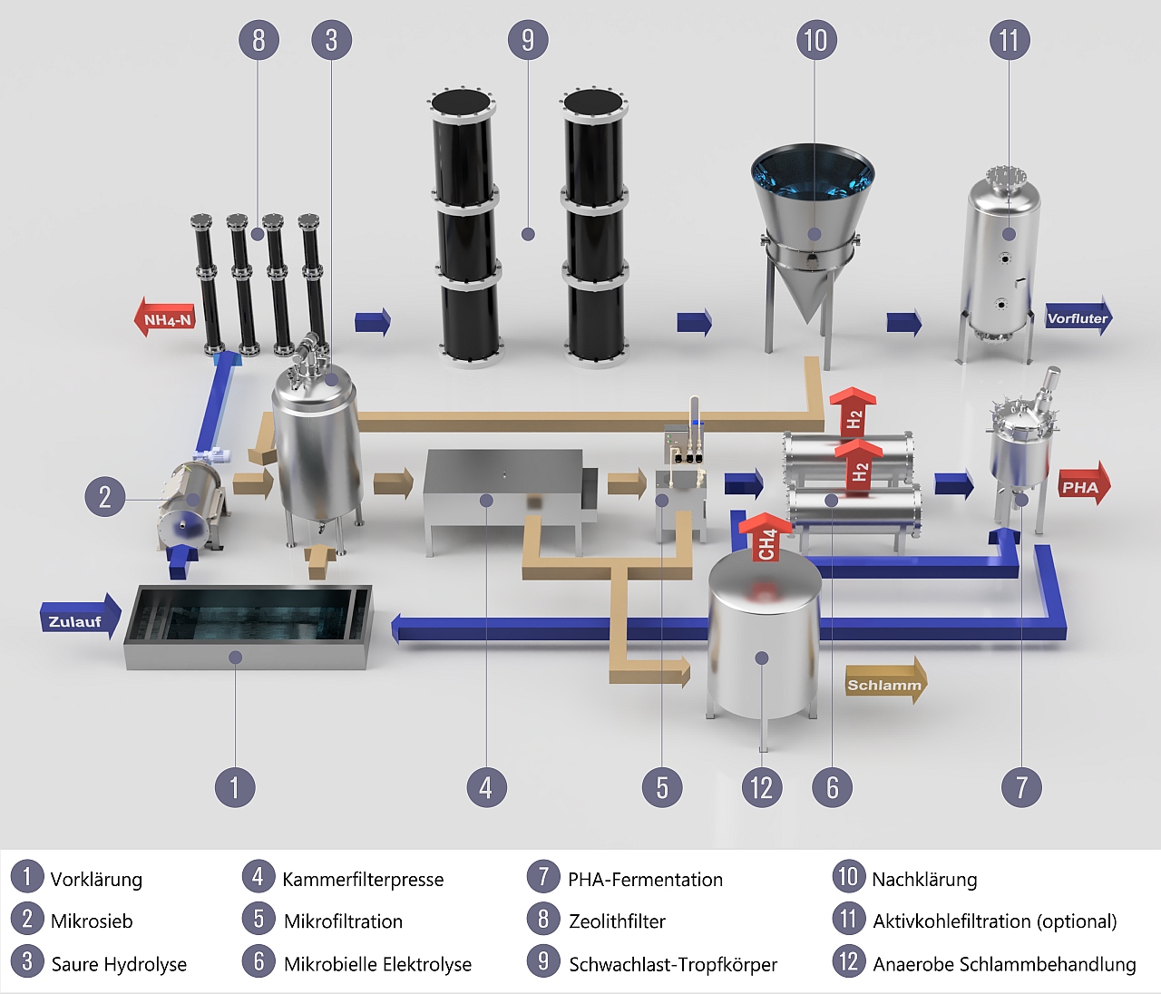 Das Konzept von KoalAplan besteht aus chemischen, physikalischen und biologischen Verfahren, deren Verschaltung im Prozessschema illustriert ist. Das ankommende Abwasser durchläuft nach der Vorklärung (1) zunächst ein neuartiges Mikrosieb (2), in dem der größte Teil der Feststoffe abgetrennt wird. Dieses überwiegend kohlenstoffhaltige Material wird einer sauren Hydrolyse (3) unterzogen, bei der organische Säuren entstehen. Aus diesen wird nach einer weiteren Feststoffabtrennung in einer Filterpresse (4) und einer Mikrofiltration (5) in einer mikrobiellen Elektrolyse (6) Wasserstoff hergestellt. Der in dabei in der Lösung verbleibende Kohlenstoff wird in einem Fermenter (7) zu Polyhydroxyalkanoaten (PHA) umgesetzt. Das aus dem Mikrosieb (2) ablaufende Wasser enthält den gelösten Ammoniumstickstoff, der in einem Zeolithfilter (8) entfernt wird. Bei der Regeneration des Filters kann dieser Stickstoff als Dünger zurückgewonnen werden. In dem nachgeschalteten Schwachlast-Tropfkörper (9) werden verbliebene Inhaltsstoffe abgebaut. Nach dem Durchlaufen eines Nachklärbeckens (10) und einer optionalen Aktivkohlefiltration (11) kann das gereinigte Abwasser in den Vorfluter entlassen werden.
