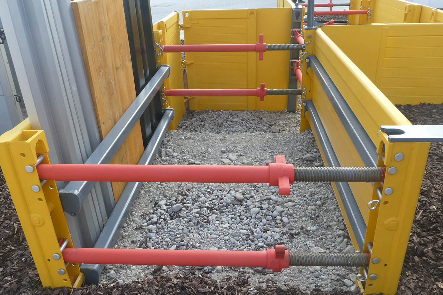 Das so vorbereitete Rahmenverbauelement wird in den ausgehobenen Graben eingehoben und positioniert. Falls erforderlich wird die Verbauplatte durch Drehen der Verbaustreben an die Grabenwand gedrückt. Der Leerraum zwischen der Grabenwand und dem eingebauten Verbauelement ist auf der ganzen Höhe kraftschlüssig zu verfüllen. „Danach können Holzbohlen, Stahl- oder Alu-Dielen senkrecht eingestellt werden, wobei die ausklappbaren Rahmenbalken dabei als Führung dienen“, so Eberhard Uelner weiter.