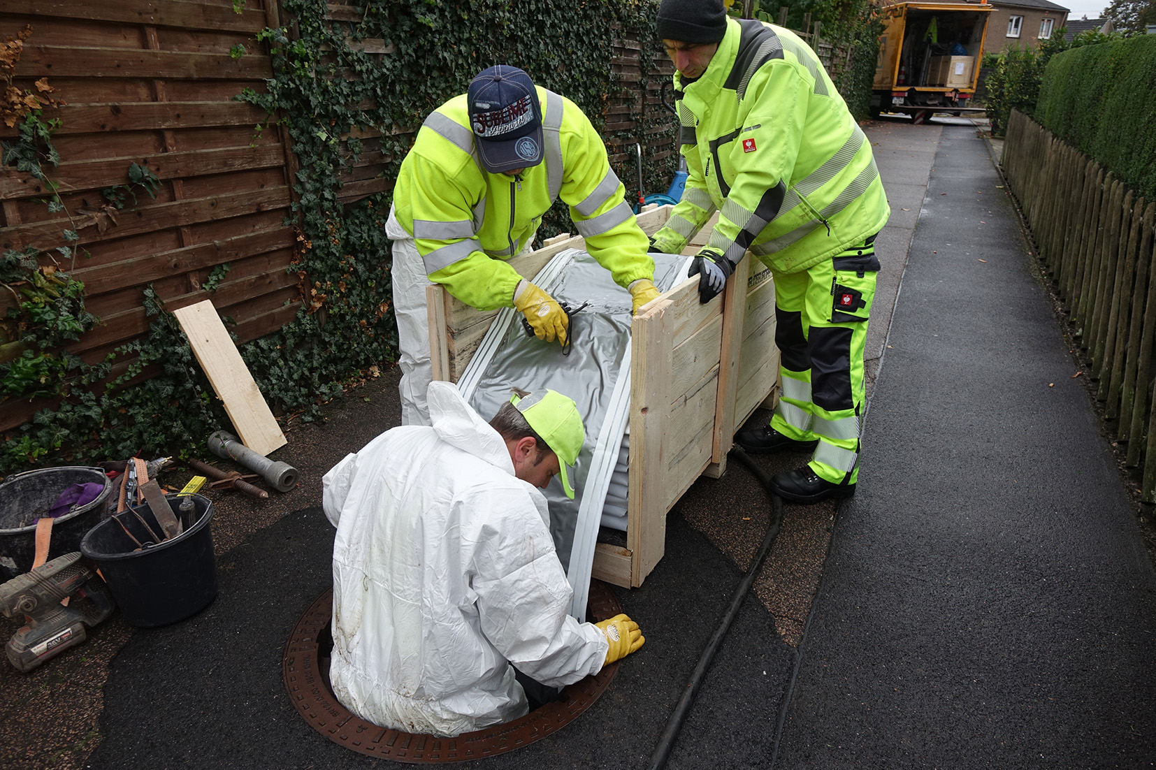 Neben den eingeschränkten Platzverhältnissen und der Art der Schäden gaben insbesondere wirtschaftliche und zeitliche Aspekte den Ausschlag für den Einzug eines GFK-Schlauchliners durch die Niederlassung Rhein-Ruhr der DIRINGER & SCHEIDEL ROHRSANIERUNG GmbH & Co. KG in Gelsenkirchen. Der Liner wurde aufgrund des relativ kleinen Profils der beschädigten Haltung vom Hersteller maßgeschneidert geliefert.