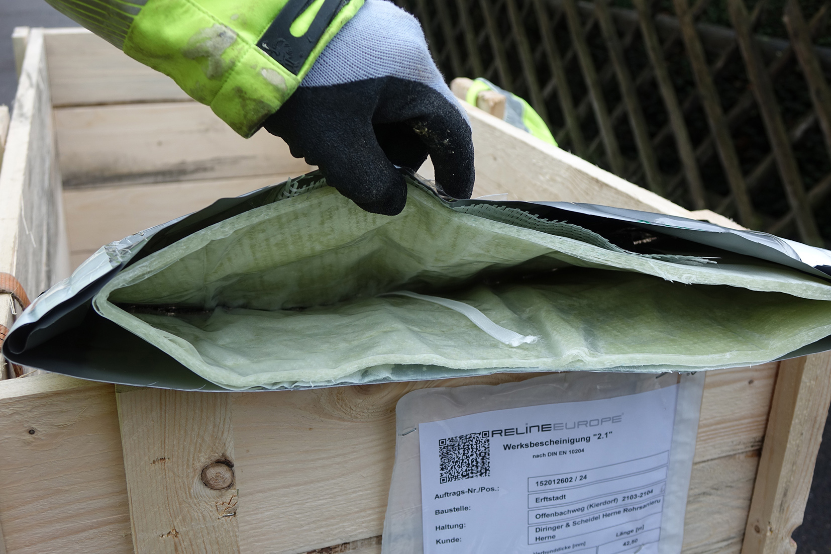 „Was die Sanierung der Haltung besonders gemacht hat, ist der relativ kleine Eiquerschnitt des Kanals mit DN 375 / 250“, erläutert Eugen Bogoslavski, Bauleiter der D&S Rohrsanierung, NL Rhein-Ruhr. „Der Liner wurde vom Hersteller passend für diese Haltung konfektioniert und mit einem Polyesterharz vorgetränkt“, so Bogoslavski weiter.