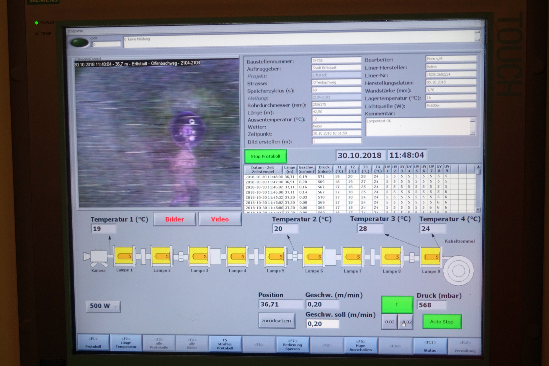 Nach erfolgreicher Kontrolle des Liners konnte der Aushärtevorgang gestartet werden. Hierfür wurden die einzelnen UV-Lampen nach und nach aktiviert und der Lampenzug mit einer Geschwindigkeit von rund 1,10 m pro Minute durch die Haltung zurück zum Zielschacht gezogen. Die Aktivierung der UV-Lampen und das Zurückziehen des Lampenzuges wurden während der gesamten Zeit im Steuerfahrzeug überwacht und die entsprechenden Messwerte aufgezeichnet.