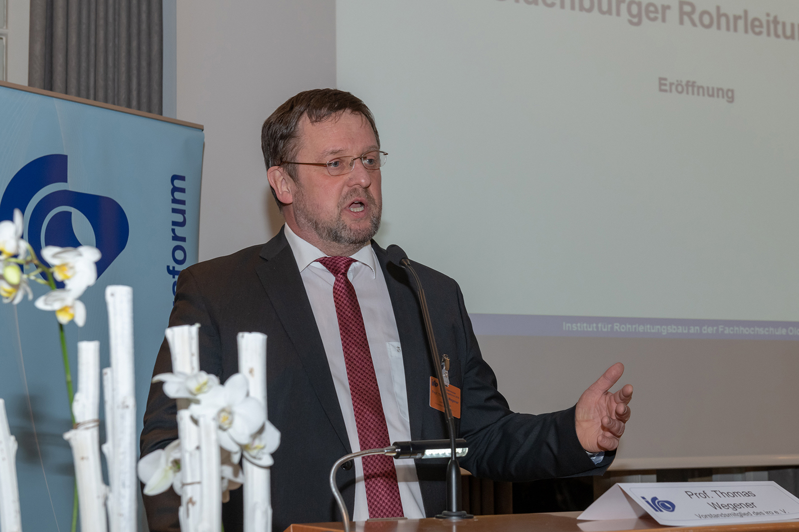 Wie in den Vorjahren eröffnete Prof. Wegener am Vorabend das Forum im ehemaligen Plenarsaal des Oldenburger Landtages. Es folgten die Begrüßung durch Prof. Dr.-Ing. Manfred Weisensee, Präsident der Jade Hochschule Wilhelmshaven/Oldenburg/Elsfleth, sowie Grußworte von Jürgen Krogmann, Oberbürgermeister der Stadt Oldenburg, und Dipl.-Ing. (FH) Fritz Eckart Lang, Präsident des Rohrleitungsbauverbandes e. V., Köln.
