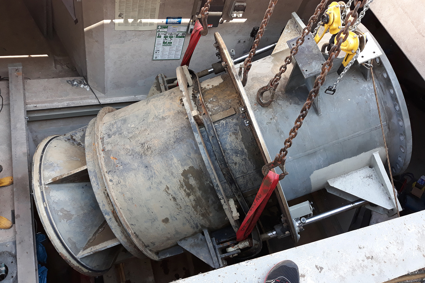 Auch die Absperrklappe und das Zwischenrohr wiesen Schäden auf, die ebenfalls instandgesetzt werden mussten. Zudem sollte das Zwischenrohr eingekürzt und mit einem neu herzustellenden Ausbaustück ergänzt werden. Dieses neue Ausbaustück soll zukünftig eine einfachere Zugänglichkeit und Wartung des Rohrstrangs möglich machen. Da für die Beseitigung der vorliegenden Schäden der Kegelstrahlschieber in seine Einzelteile zerlegt werden musste und auch das Einkürzen des Zwischenrohres nicht vor Ort erfolgen konnte, wurden beide Bauteile aus der Anlage ausgebaut, extern aufgearbeitet beziehungsweise bearbeitet und anschließend wieder eingebaut.