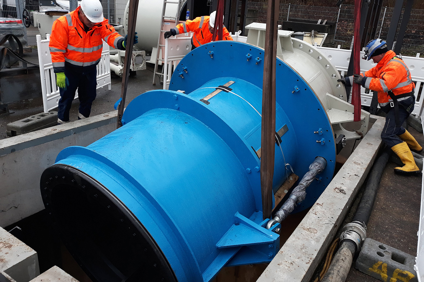 Dies erfolgte Anfang 2018 beziehungsweise im gleichen Jahr im Dezember während der turnusmäßigen Außerbetriebnahme der Schleuse für Inspektionszwecke. Für die Zeitdauer zwischen Aus- und Wiedereinbau wurden die verbleibenden offenen Rohrenden mit Blindflanschen und Dichtungen verschlossen, damit kein Wasser in den Antriebsraum eindringen konnte.
