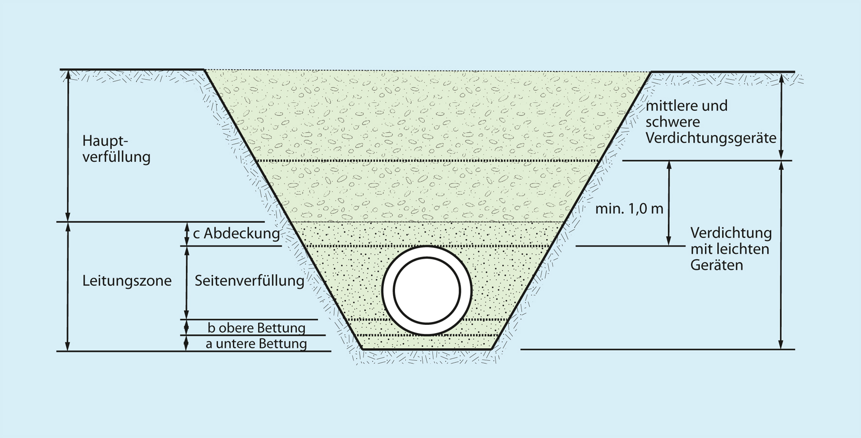 Grundsätzlich darf in der Leitungszone nur von Hand oder mit leichten Verdichtungsgeräten verdichtet werden. Es ist unbedingt darauf zu achten, dass die Rohrleitung dabei nicht zur Seite oder in der Höhe verschoben wird. Die mechanische Verdichtung der Hauptverfüllung direkt über dem Rohr sollte erst erfolgen, wenn eine Schicht mit einer Mindestdicke von 300 mm über dem Rohrscheitel eingebracht worden ist.