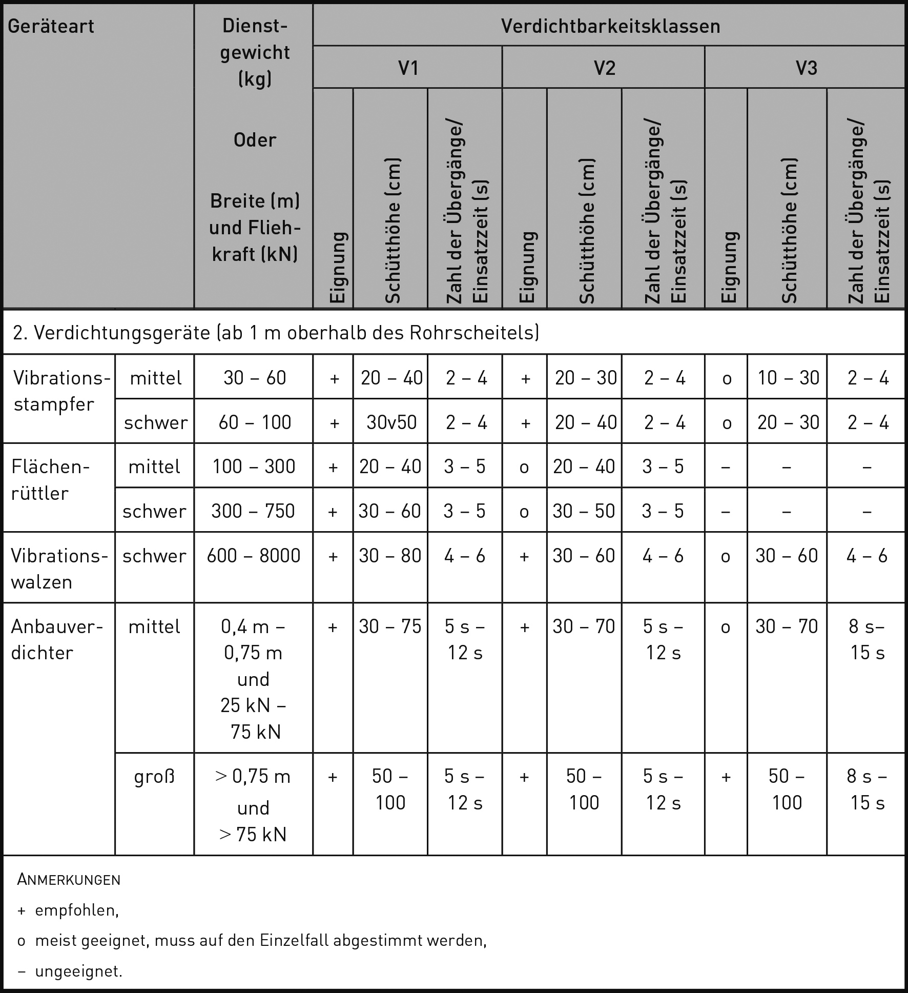 Die Wahl des Verdichtungsgerätes, die Zahl der Verdichtungsdurchgänge und die zu verdichtende Schichtdicke sind auf das zu verdichtende Material und die einzubauende Rohrleitung abzustimmen. Der Boden ist lagenweise einzubauen und zu verdichten. Die Anzahl der Übergänge und die Dicke der eingebauten Schicht sind an das verwendete Verdichtungsgerät anzupassen.