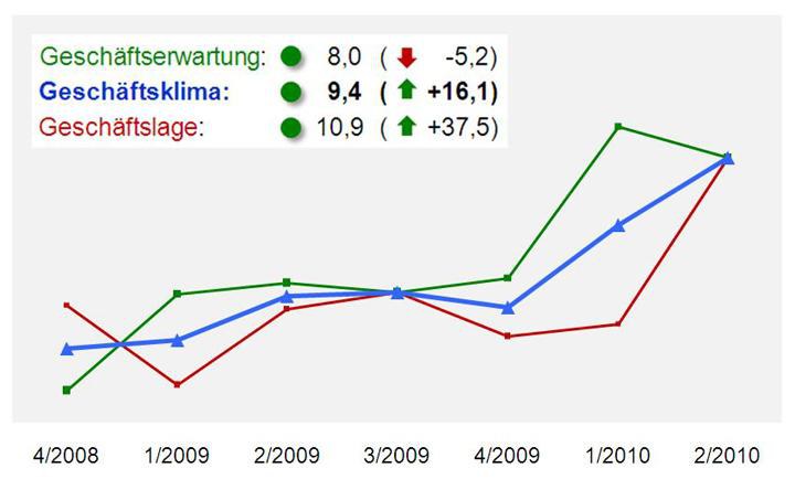 Vor allem die Bewertung der Geschäftslage hat sich erheblich verbessert. Der Index für die Geschäftslage stieg im 2. Quartal nach Realisierung des hohen Nachholbedarfs aus dem langen Winter auf einen Wert von 10,9, dies ist eine Steigerung um insgesamt 37,5 Punkte. Ein deutlicher Aufschwung zeigt sich in den Bereichen Versorgung, Entsorgung und Industrie, der Aufschwung im Bereich Haustechnik verschiebt sich voraussichtlich ins 3. Quartal. Die Ertragslage liegt trotz ihres erheblichen Anstiegs dennoch generell noch unter Vorjahresniveau.