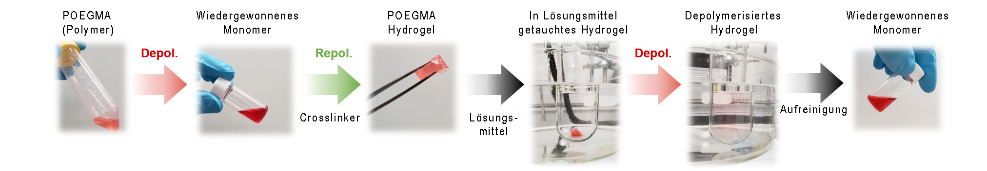 Aus den zurückgewonnenen Bausteinen lassen sich gemäß Anastasaki das gleiche Polymer oder ein völlig anderes Produkt, ein unlösliches Hydrogel, das ebenfalls in seine Monomere zerlegbar ist, herstellen. Die neu erzeugten Produkte sind gleichwertig wie das ursprüngliche Produkt. Das steht in Kontrast zu bisherigen Produkten, die aus rezyklierten Polymeren hergestellt wurden.