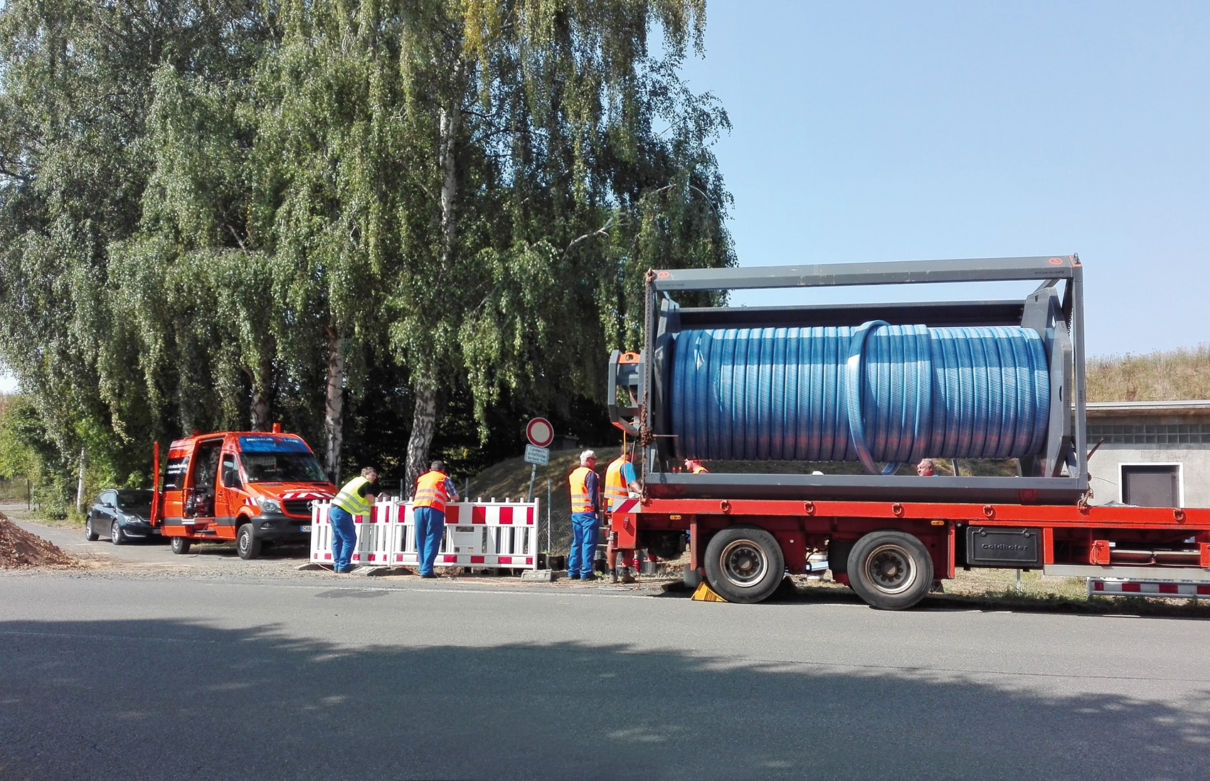 Der werkseitig in U-Form gefaltete Primus Liner DN 200 wurde auf einer Transporttrommel angeliefert und an der Baugrube positioniert (Bild). Eine 3-Tonnen Spillseilwinde zog den Inliner in einem Zug innerhalb von ca. vier Stunden in die Leitung ein.