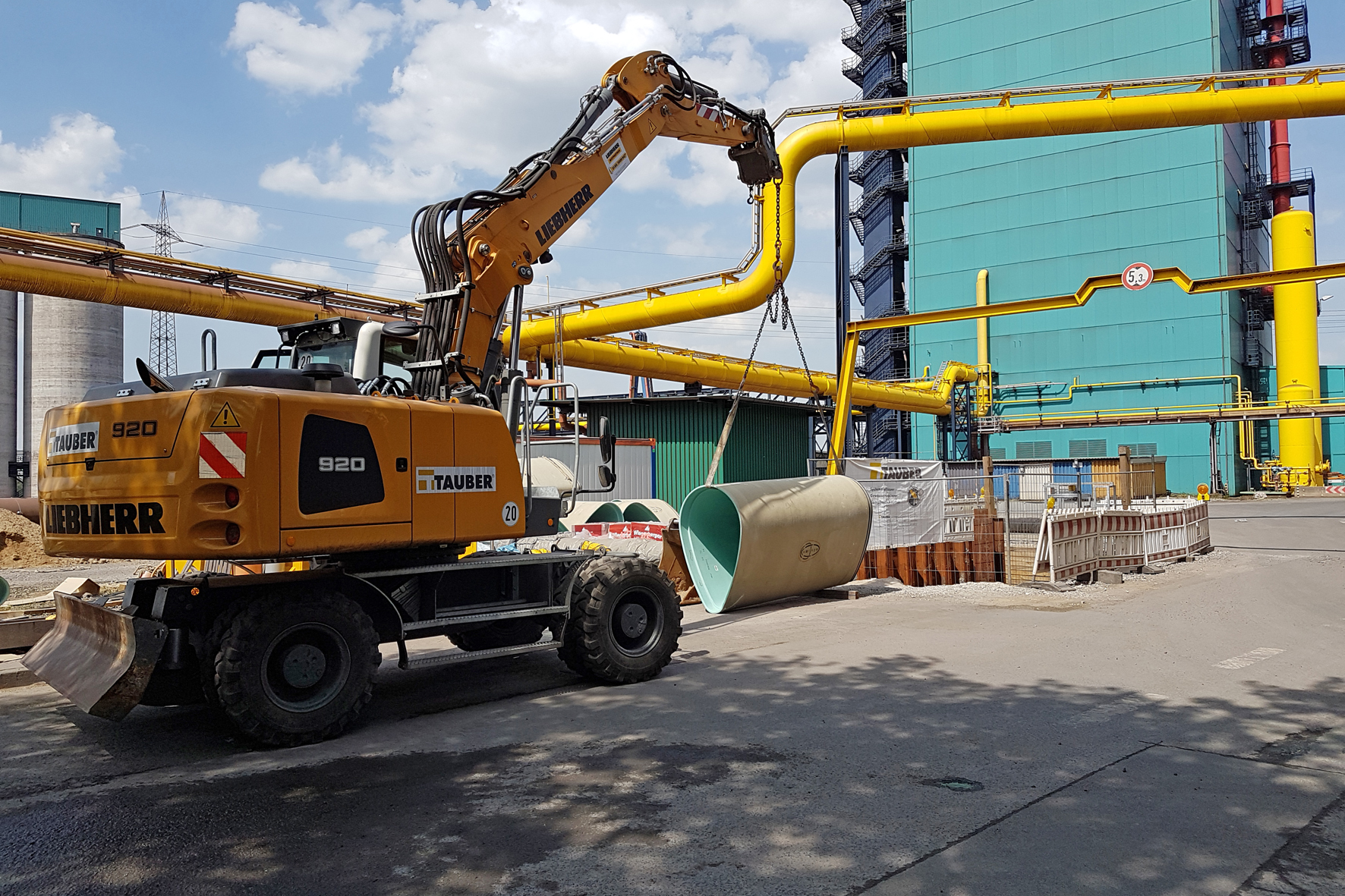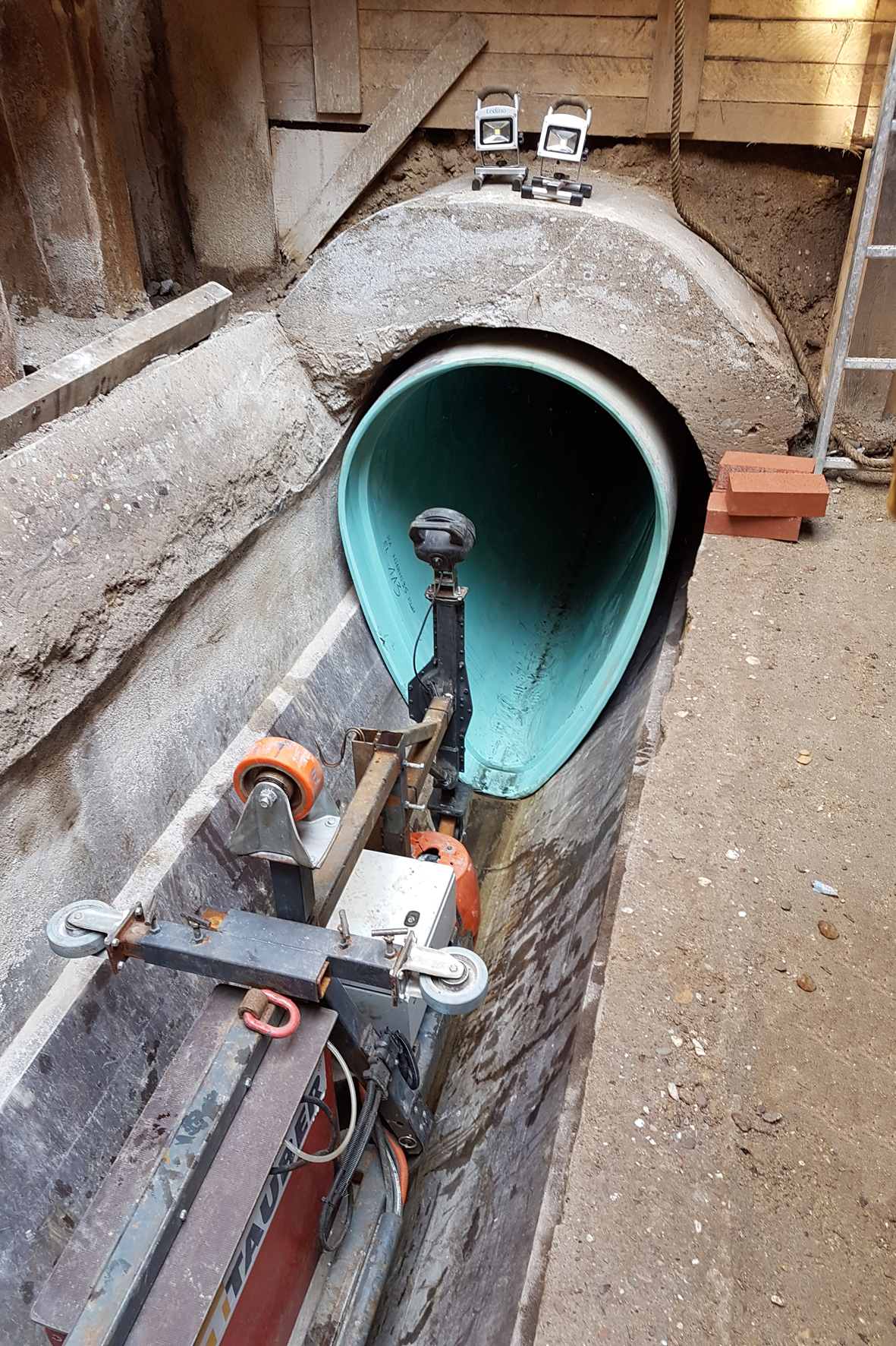 „Nach Starkregen mussten auch schon mal bis zu 2500 m3 Wasser pro Stunde bewältigt werden“, erinnert sich Bernhard Wilke. Zur Verlegung der Rohre wurde im Sanierungsabschnitt zusätzlich eine „Einziehgrube“ angelegt. In diese Baugrube sind dann durch einen Bagger die GFK-Eiprofile zum Einbau abgesenkt worden. Die Kurzrohrprofile wurden dann von hier aus in zwei Richtungen bis an die Endpunkte der Sanierungsstrecke eingebracht. Die Arbeit erledigte eine eigens von Tauber entwickelte Verlegemaschine.