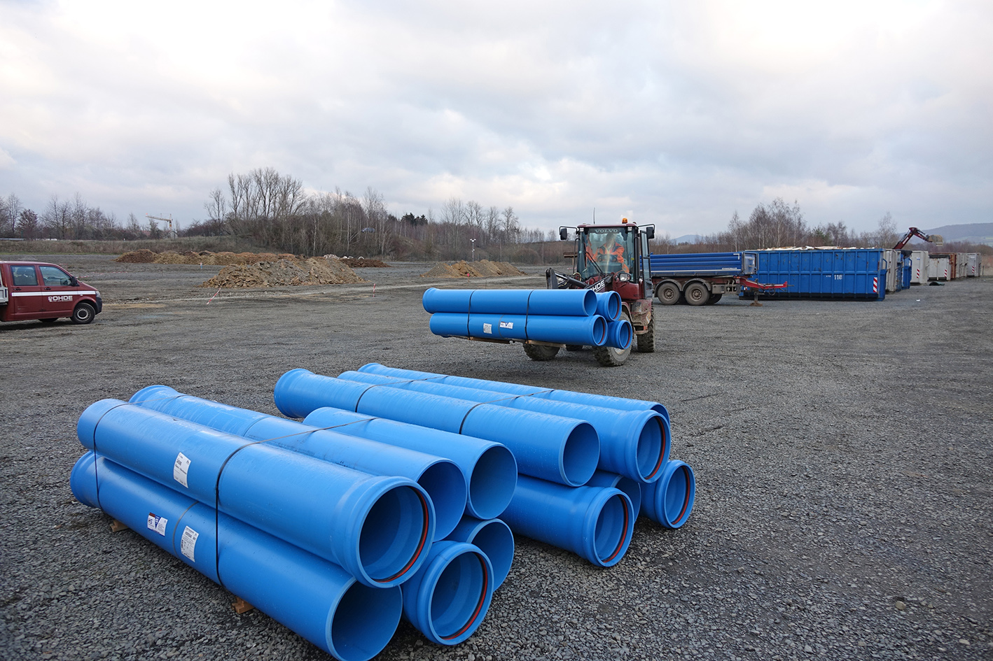 Für die Erstellung einer neuen Regenwasserkanalisation baute die mit der Ausführung der Arbeiten beauftragte Heinrich Rohde Straßenbau GmbH, Korbach-Meineringhausen, auf einer Gesamtlänge von rund 550 m blaue HS®-Kanalrohre SN 12 der Funke Kunststoffe GmbH in Nennweiten von DN/OD 160 bis DN/OD 710 ein. Eine besondere Herausforderung stellte dabei der schwierige Bauuntergrund vor Ort dar, der zunächst eine Bodenverbesserung notwendig machte.