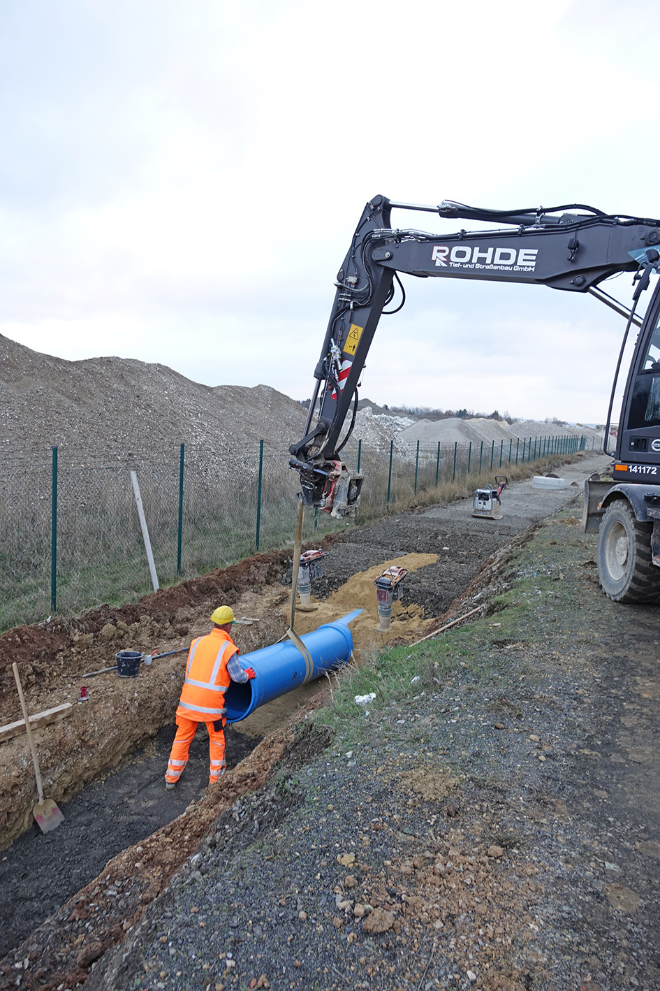 Um das anfallende Regenwasser von den neuen versiegelten Verkehrsflächen sowie von der Dachfläche der neuen Lagerhalle abzuleiten, war allerdings ein Ausbau der bestehenden Infrastruktur erforderlich. „Nachdem wir mit einer TV-Befahrung die Funktionstüchtigkeit des westlich Nord-Süd-Betriebsweg verlaufenden Regenwasserkanals überprüft haben, haben wir die notwendigen Haltungen für das Betriebsgelände geplant“, berichtet Dipl.-Ing. Joachim Oster, Geschäftsführer agc – aqua geo consult, Kassel.