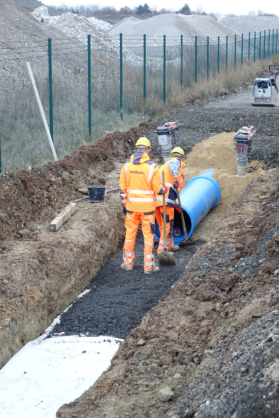 Torsten Stremmel, Schachtmeister bei Heinrich Rohde, erläutert die einzelnen Schritte, die für die Herstellung des Leitungsgrabens erforderlich waren: „Nach dem Aushub haben wir den Sohlenbereich, der auf der Strecke in 2,00 bis 3,20 m Tiefe lag, mit Kalk versetzt und ein Schotterpolster aufgebracht. Dieses wurde dann mit Geotextil abgedeckt.” Bis in eine Tiefe von 1,50 m habe man in der Grabensohle zudem weitere punktuelle Bodenverbesserungen vorgenommen. Erst dann wurden die neuen Rohre eingebaut.